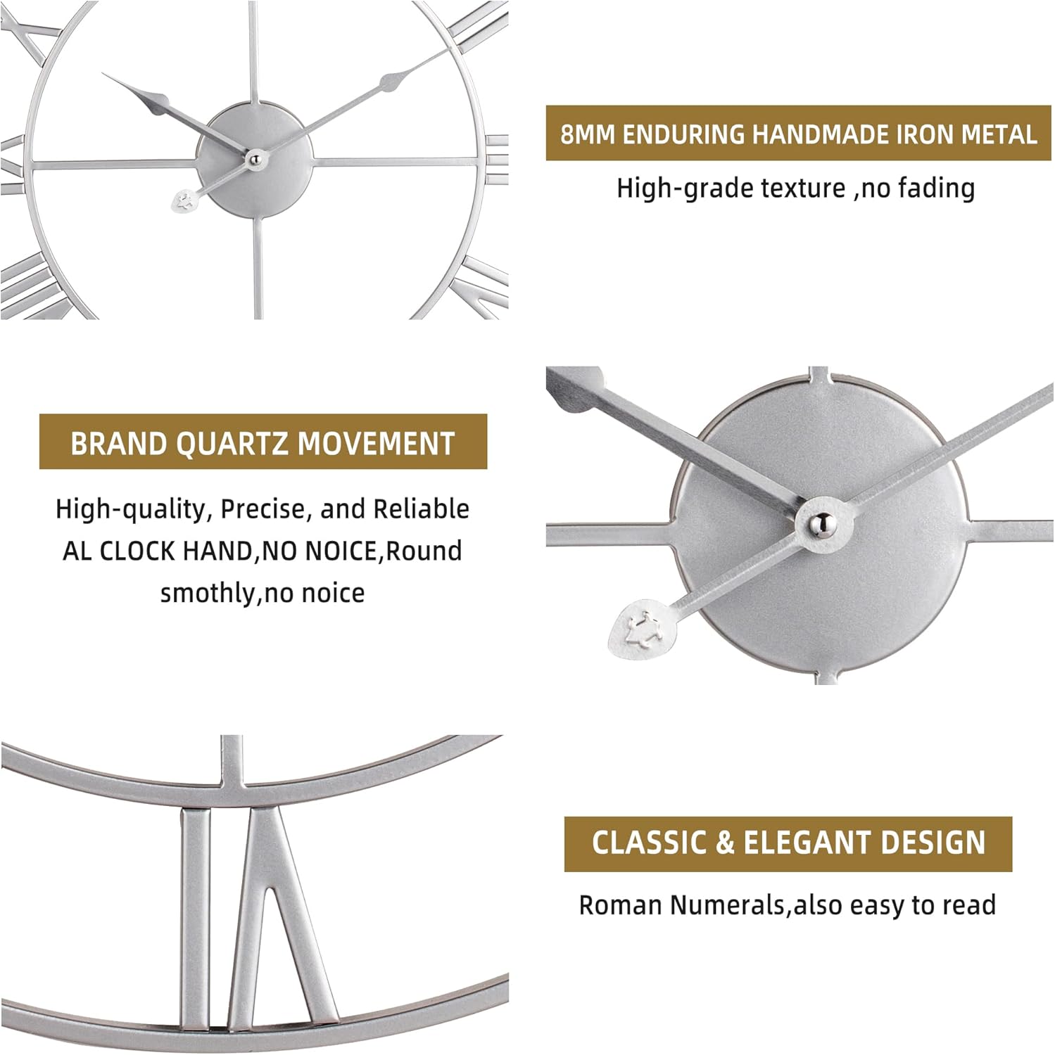 Large Wall Clock - 80cm/ 32 Inches, Silver, Non-Ticking, Battery Operated, Vintage Modern Wall Clock for Living Room, Bedroom, Office, Farmhouse Decor