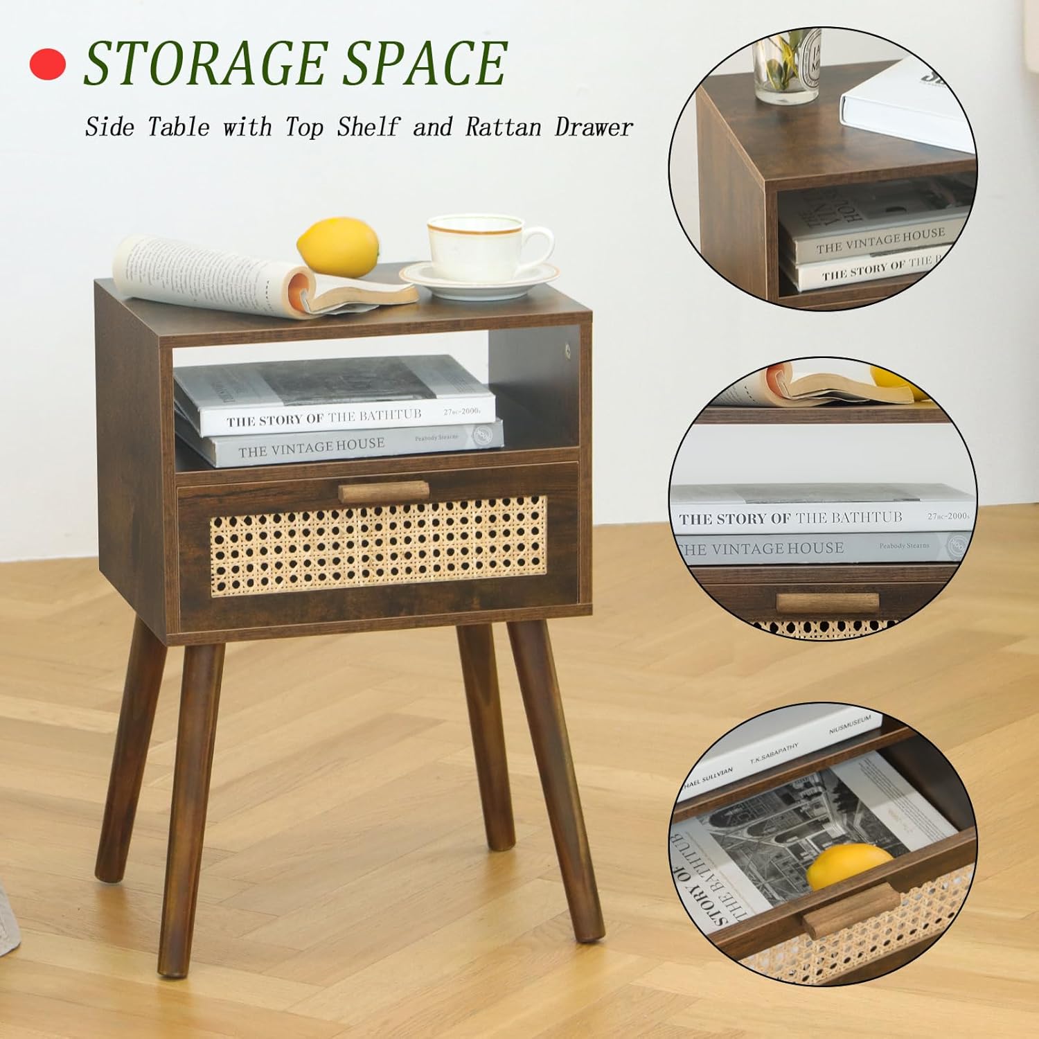 MaxSmeo Mid Century Nightstand, Rattan Side Table with Drawer, Wood Modern Bedside Table for Bedroom, Living Room and Small Spaces (Rustic Brown)