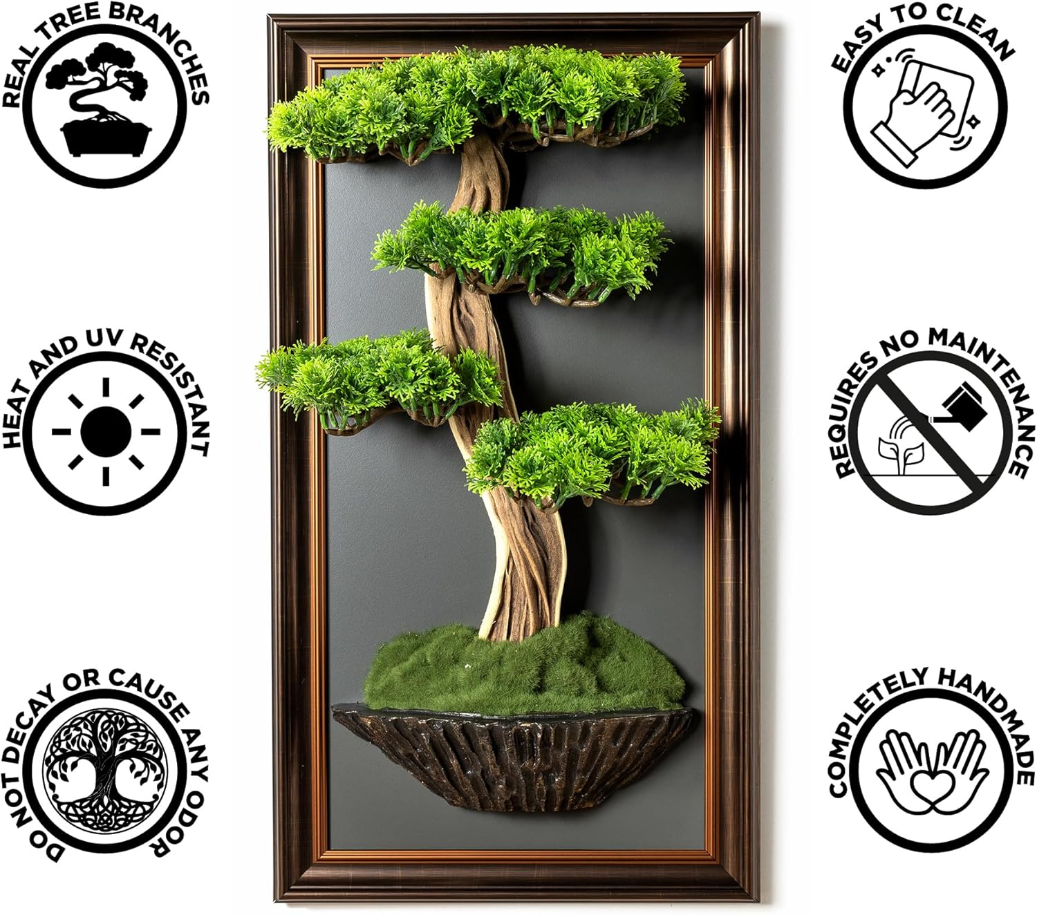 - Unique Handmade Design: Each Bonsai Art Life Tree Tableau is meticulously crafted by hand, ensuring a one-of-a-kind piece of art that brings a touch of nature and tranquility to any space. The tree body features a rich brown color, adding to its natural appeal.