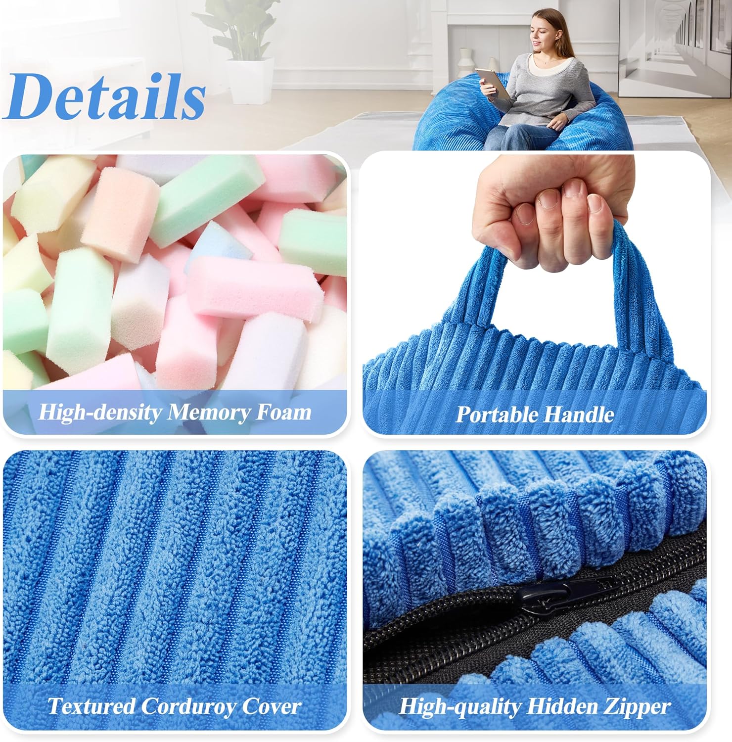 - COMFORTABLE & DURABLE FABRIC: Our bean bag chairs are made of textured corduroy, which is skin-friendly. The cover can be machine washable so that you can clean it like new. The filled memory foam is high-density, which is easily rebound and make you feel relaxed once you lie down or sit on the chairs.