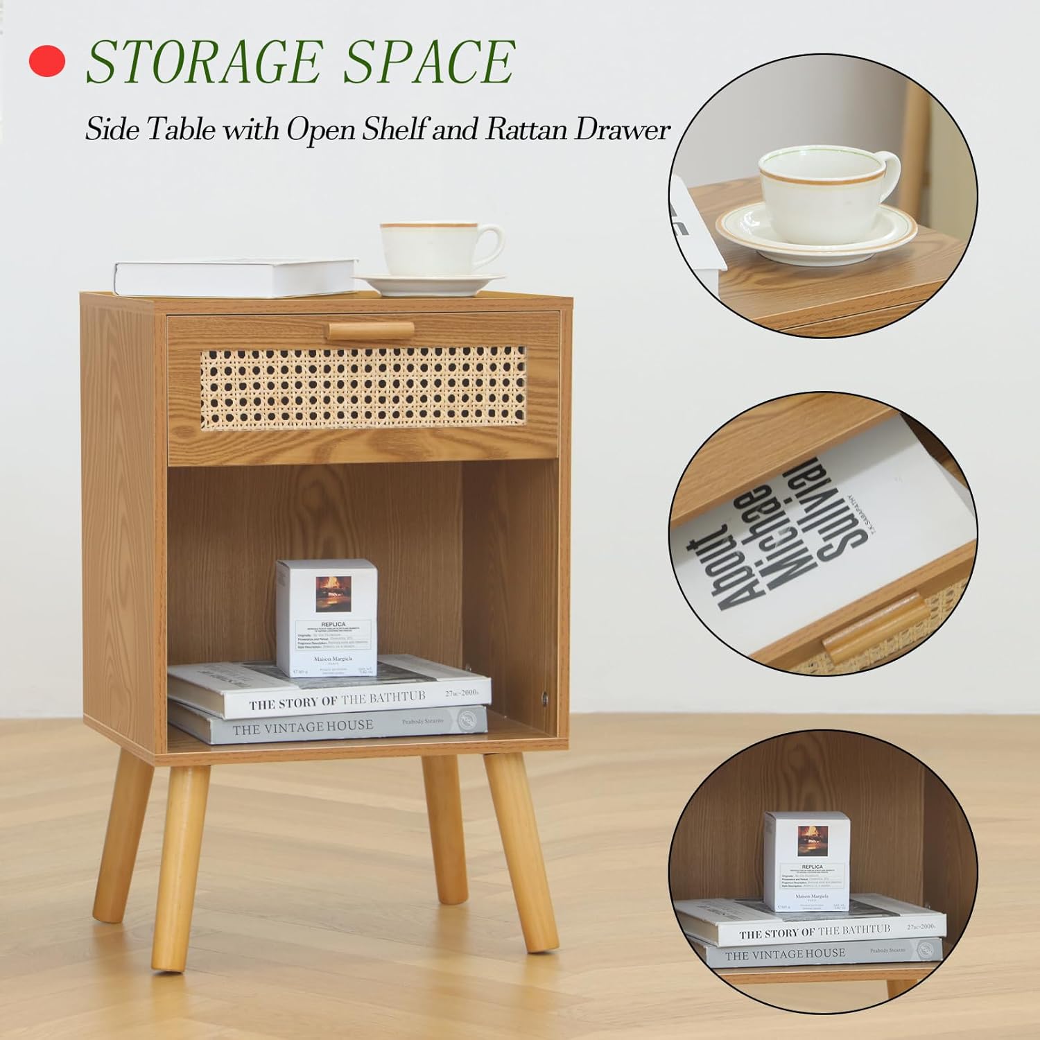 Mid Century Modern Nightstand, Rattan Bedside Table with Drawer and Open Shelf, Wood Nightstand Modern Side Table for Living Room, Bedroom and Small Space, Brown