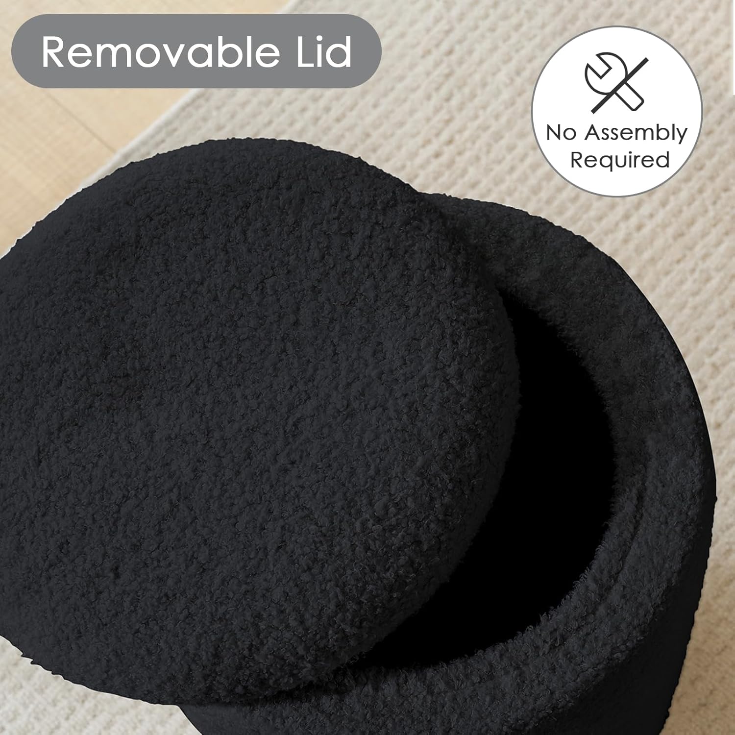 YFO Round Boucle Ottoman with Storage, Multifunctional Upholstered Vanity Chairs for Makeup, Soft Padded Seat with Removable Lid, Modern Rest Stool Seat for Living Room, Bedroom, Black