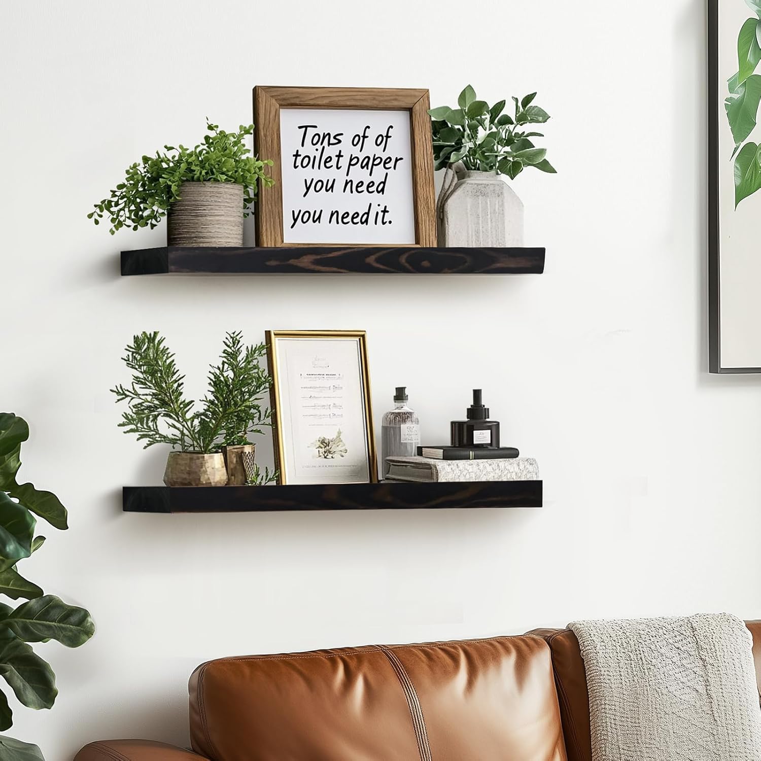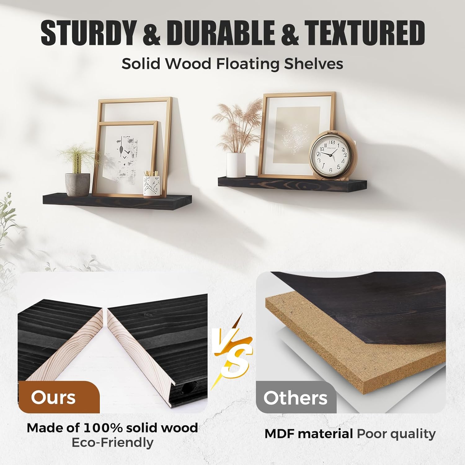 Floating Wall Shelves - 16"x6.8"x1.2" Sturdy Rustic Black Solid Wood Shelves for Storage and Décor, Easy Installation for Living Room, Bedroom, and Kitchen - 2 Pack