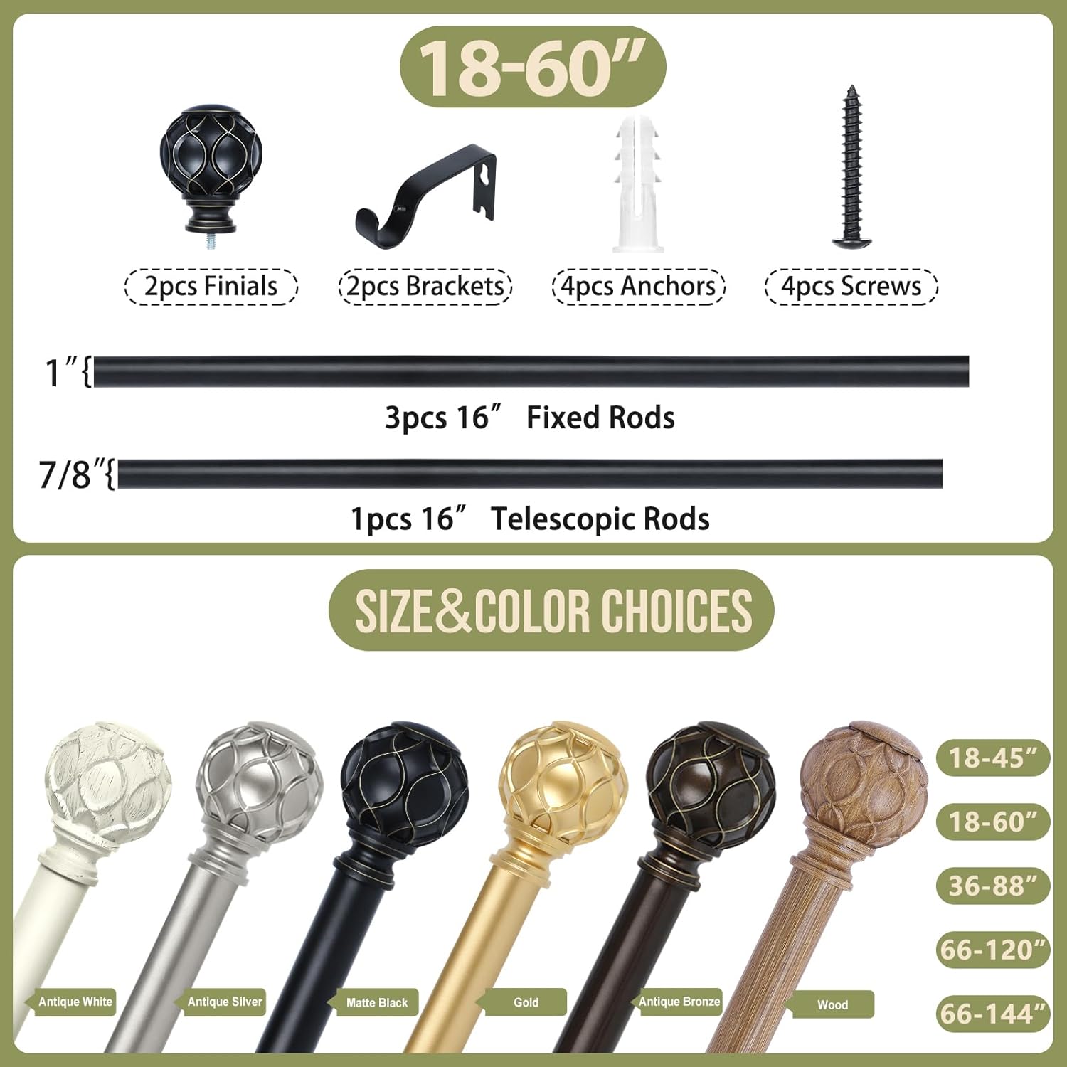 - Curtain Rods for Windows 18 to 60 Inch(1.5-5Ft):TANGWIN drapery rods include 3 x 16" x 1"fixed rods, 1 x 16" x 7/8"adjustable rods, 2 x finial, 2 x bracket, 2 x connector, 4 x anchor, 4 x screw.Matte black curtain rods for windows can extend from 18 to 60 inches, choose the right size curtain rods according to the length of your window.