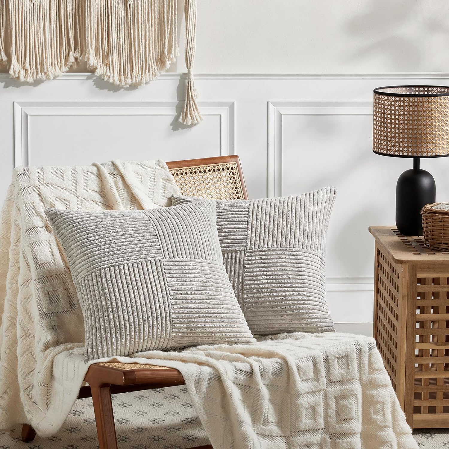 Fancy Homi 2 Packs Neutral Grey Decorative Throw Pillow Covers 16x16 Inch for Living Room Couch Bed, Rustic Farmhouse Boho Home Decor, Soft Corss Patchwork Corduroy Textured Square Cushion Case 40cm