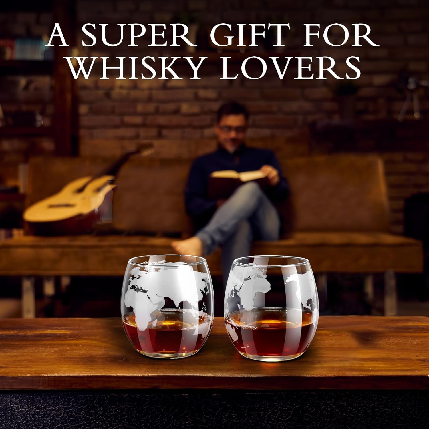 - IMPREES WITH ELEGANCE AND STYLE --- EXQUISITE GLOBE GLASSES ETCHED WITH CONTINENTS OF THE WORLD - The beautiful frosted effect on these globe whiskey glasses creates a striking design, while also being subtle enough to show off the beautiful hue and glow of the whiskey within them.