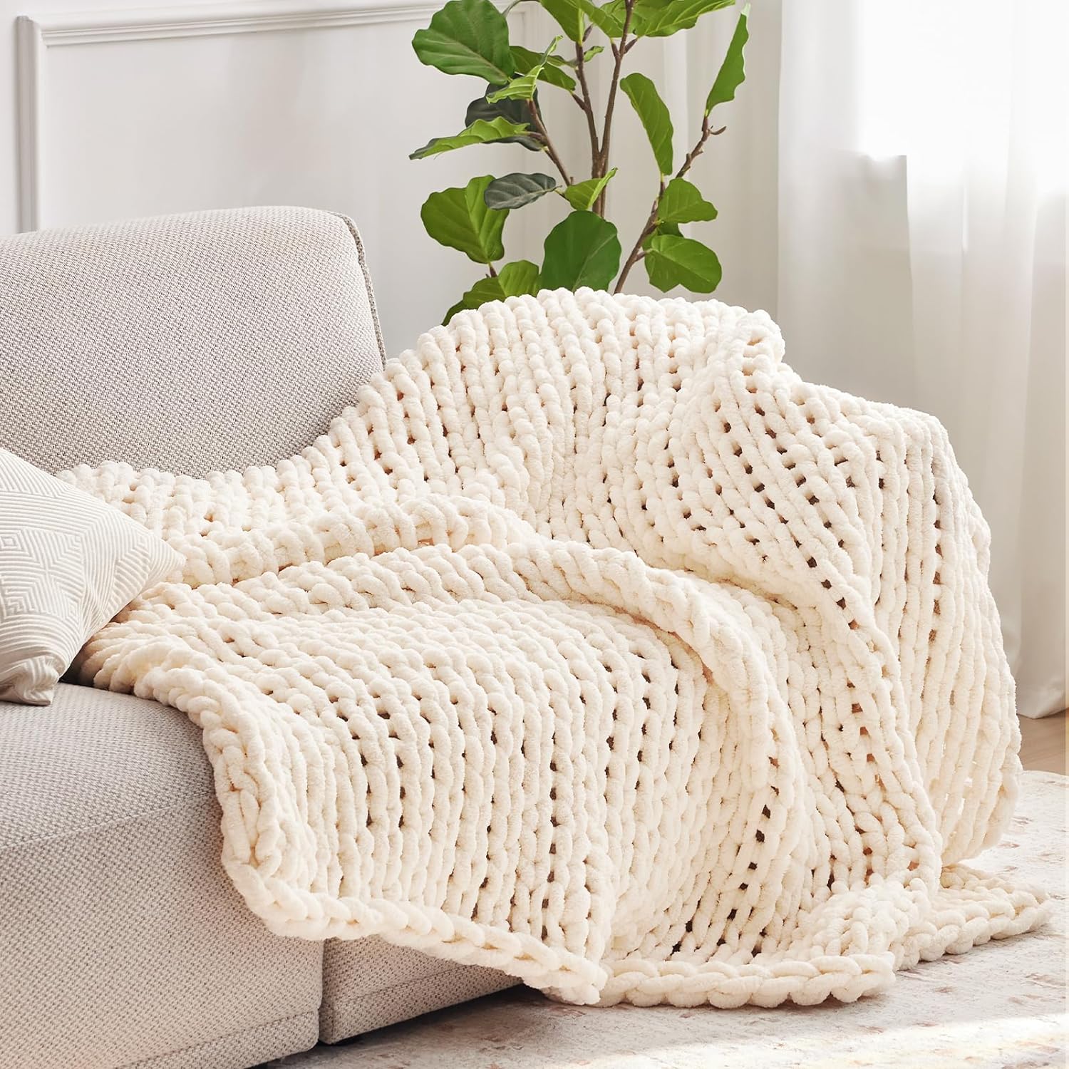 Chunky Knit Throw Blanket, 60''*80'' Knitted Throw Chenille Yarn for Bed Couch, Handmade Cream Crochet Big Thick Blanket, Machine Washable Cute Comfy Blanket for Home Decor