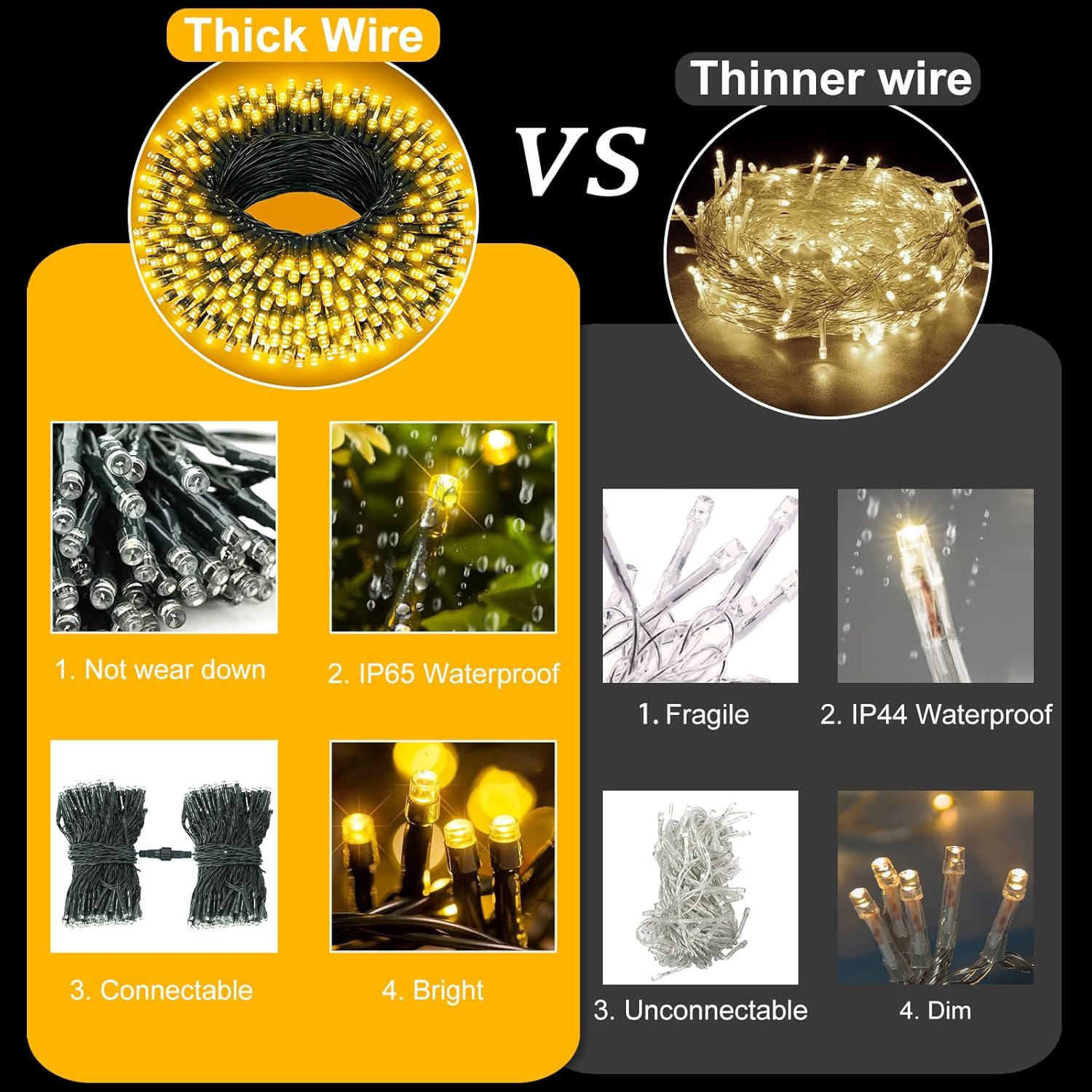 - ăWaterproof and Durableă: The plug in fairy lights made with high quality copper and plastic, which makes it stronger and more durable. IP65 Waterproof designed, resistant to weather changes and could withstand rain, snow and other bad weathers, ideal for year-round use. But please note that plug not waterproof.