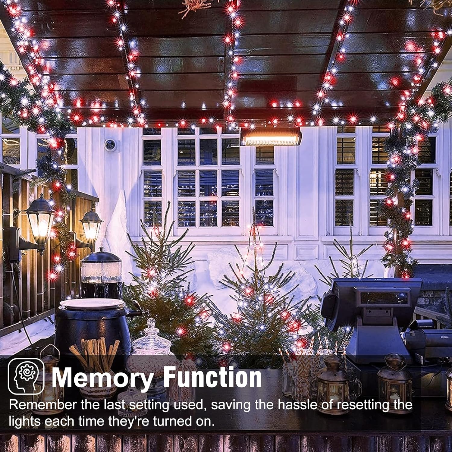 - ă8 Lighting Modesă: This red white Christmas lights has 8 different lighting modes to choose from: combination, in waves, sequential, slo-glo, chasing/flash, slow fade, twinkle/flash, steady on. Press the button on the adapter to change the flashing modes. Moreover, built-in memory chip will save your last mode setting.