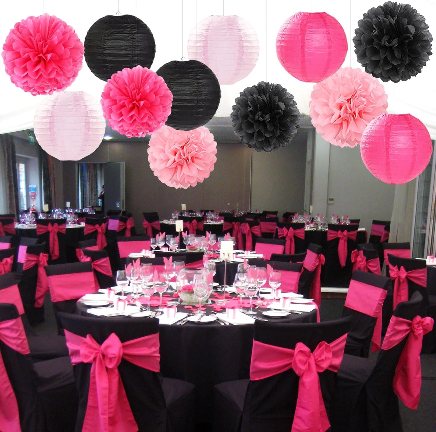 Hot-Pink Black Party-Decorations Paper Flowers Lanterns - 15PCS Graduation Birthday Tissue Pom Poms Streamers,Baby Girl Women Bachelorette Hanging Supplies Decor Hugfond