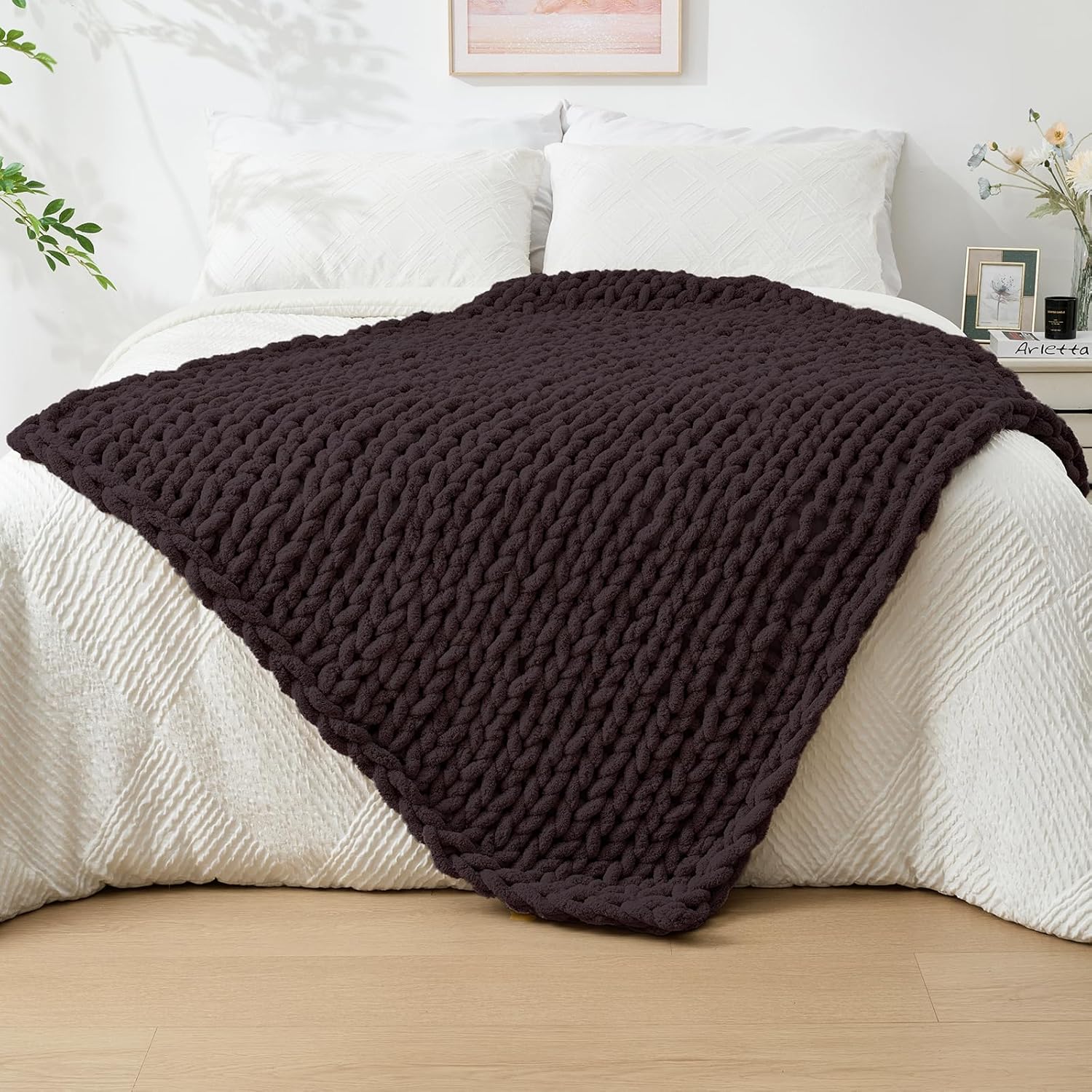 Bigacogo Chunky Knit Throw Blanket for Couch, 40x60 inches, 100% Hand Knitted with Thick Jumbo Chenille Yarn, Cozy Soft Large Rope Knot Cable Crochet Blankets for Sofa Bed Living Room, Chocolate