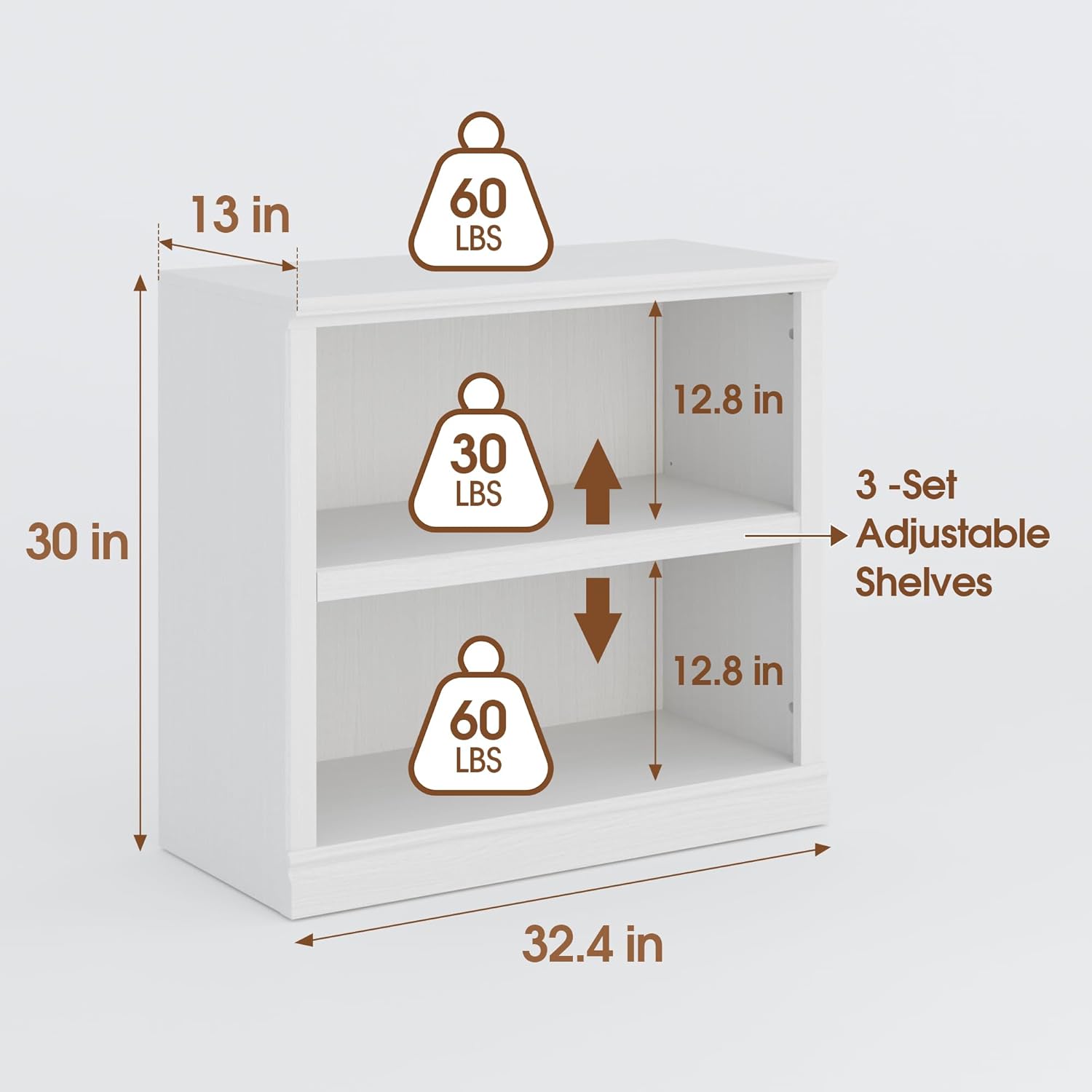 30" Bookcase, White Floor Standing Bookshelf, 2-Tier Display Shelves Open Storage Organizer, Book Case for Living Room Hallway Kitchen Home Office Bedroom, White 2 Tiers