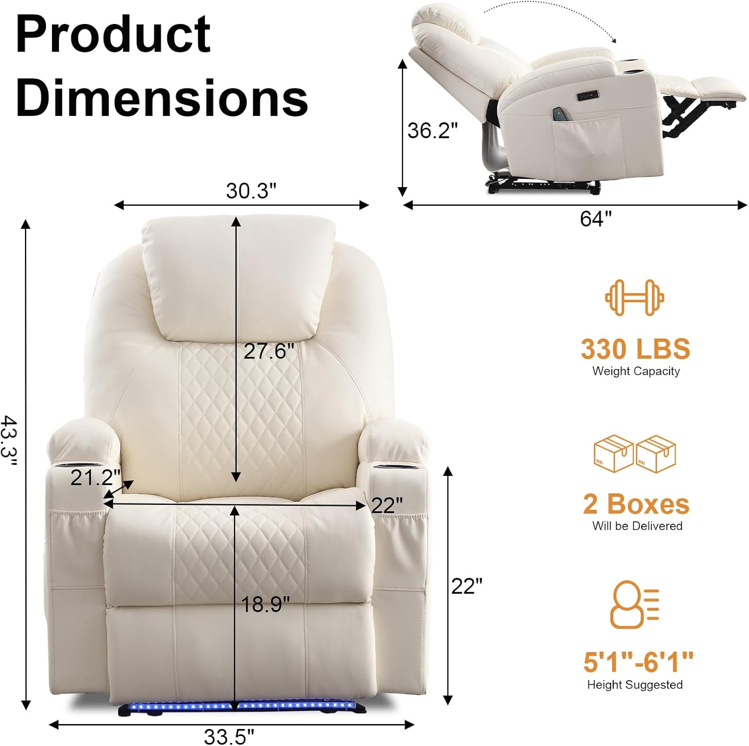- Power Recliner: Our power recliner only need to press the buttons of the right side chair, it can slowly recline while lifting the foot pedal. You can also set your favorite angle and easily adjust it between 95 ° and 160 °, bringing you the ultimate comfort experience. It is the best choice for your rest, watching movies, and reading.