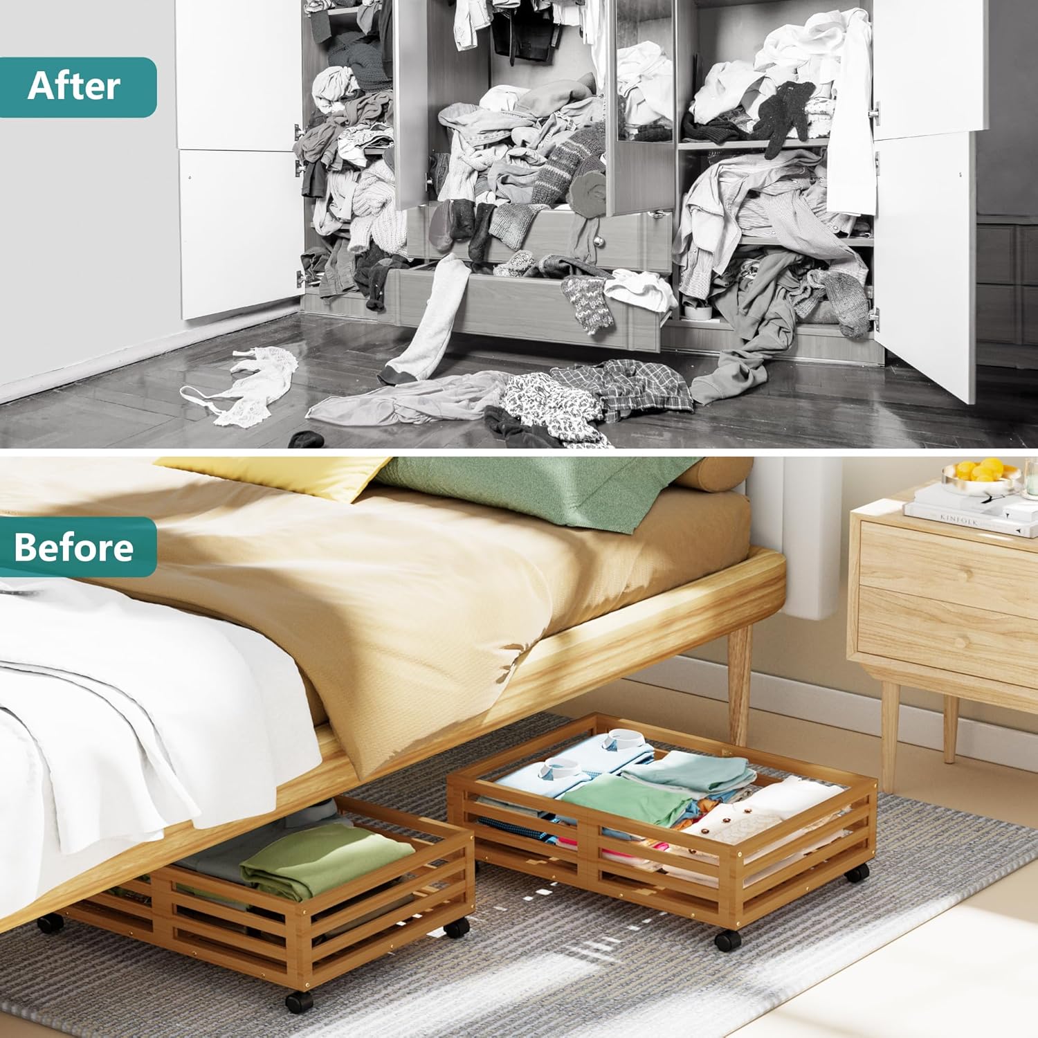 - 👍[Sturdy and Durable] Our under bed storage with wheels is crafted from premium wood bamboo, boasting 4 rotating wheels and a capacity of 120lbs. This 'under bed storage' solution includes non-woven bags for efficient organization of clothes, books, shoes, and toys.