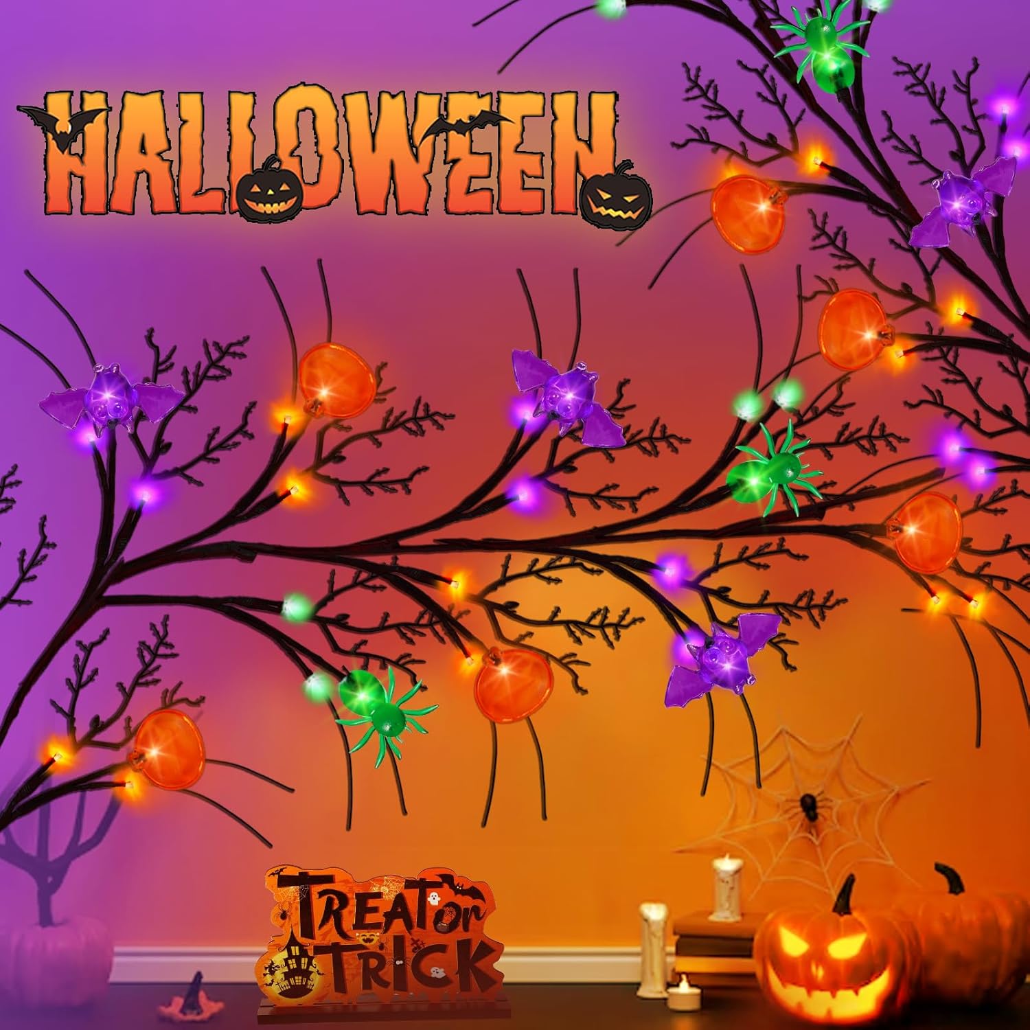 - 🎃【Halloween Willow Vine Decorations】6-Foot Willow Vine Twig Garland, lifelike Halloween willow vine lights are the perfect way to transform your space into a haunted wonderland. With 54 vibrant orange, purple, and green LED lights, including 6 pumpkin lights, 6 bat lights, and 6 spider LED lights, you can use them to create a wonderful Halloween atmosphere for your home