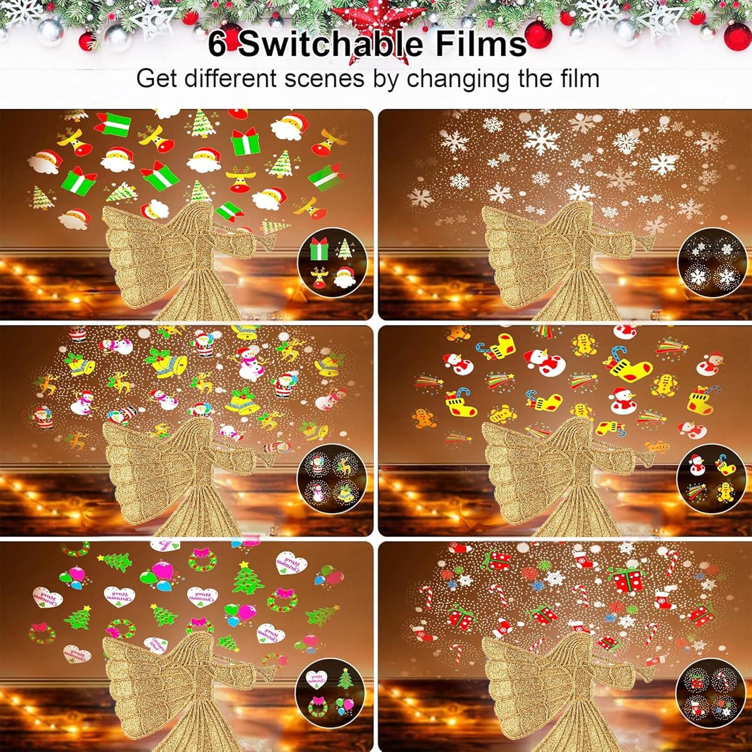 - LED projector: Multifunctional projector angel topper, built-in a 4 LED with auto-moving motor, projecting an animated 6 different photos effect of dynamic dancing 6 different photos spots patterns, a vivid snowy picture indeed. The upward shooting area reaches 21-53 sq.Ft., sufficient for a common room or living room decorating