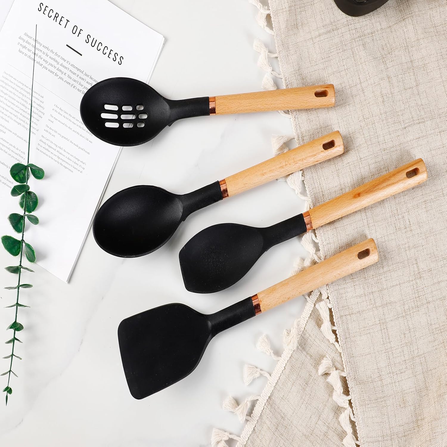 13-Piece silicone utensil set wood handle nonstick cookware safe dishwasher safe kitchen tools BPA free heat resistant (450°F/230°C) ceramic pan safe cooking gifts housewarming (Black)