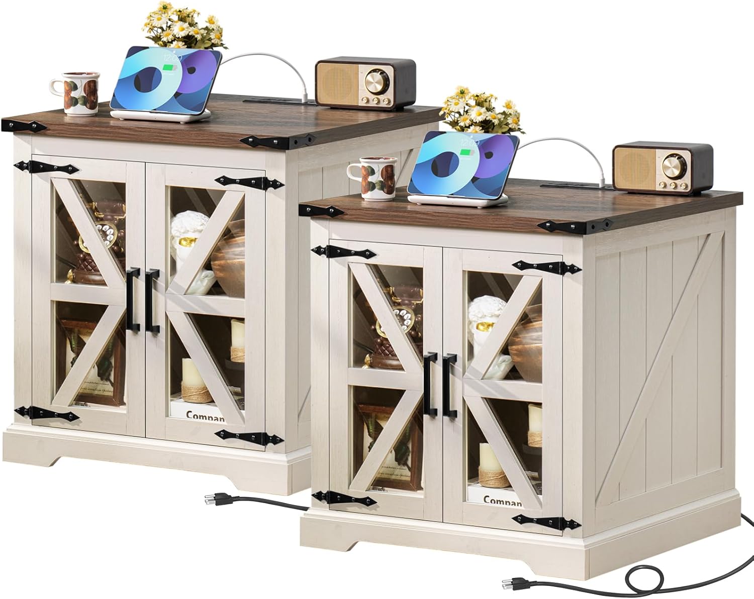 24" End Table Set of 2 with Charging Station, Farmhouse Night Stand with Glass Barn Door, Nightstands with Adjustable Storage Shelf, Large Wood Square Bed Side Table for Living Room,Bedroom