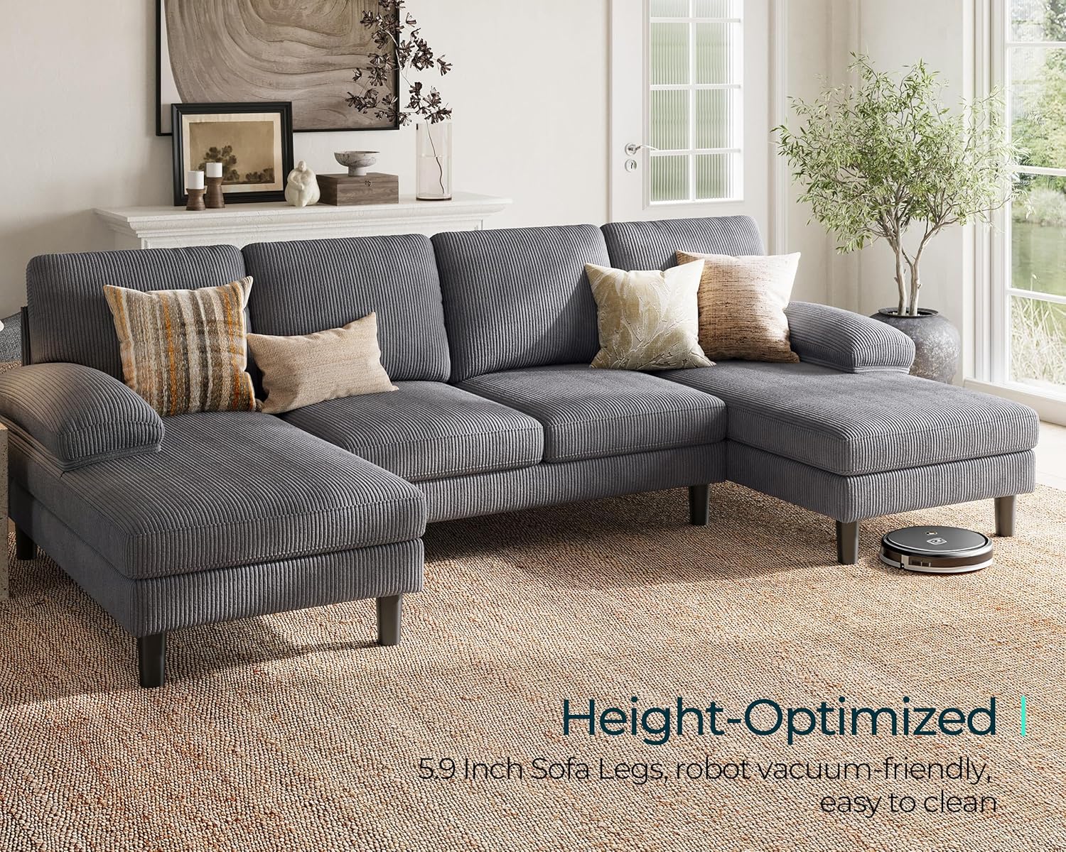LINSY HOME Sectional Couch, 111'' W Corduroy U Shaped Sofa with Sleepable Armrests, 4 Seat Couch with Double Chaises, Deep Sofa for Living Room, Grey