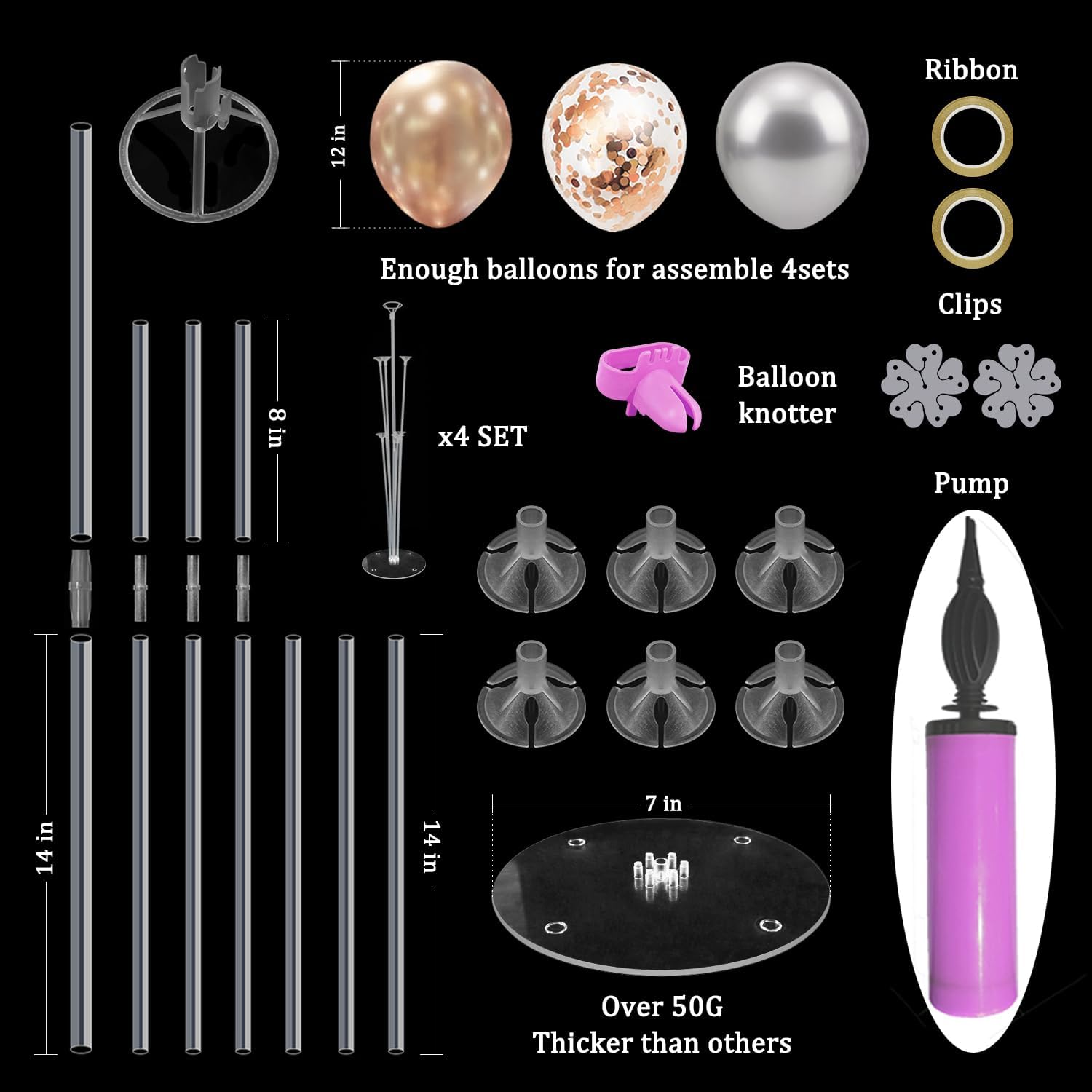 - WHAT INLCUDE: This balloon stand kit include 4 set balloon holders, 36 pcs balloons - champagne and silver balloons, rose gold confetti balloons, 1 pc balloon pump, 2 pcs balloon clips, 2 rolls ribbons, 1 pcs glue dots and 1 pc tie tool