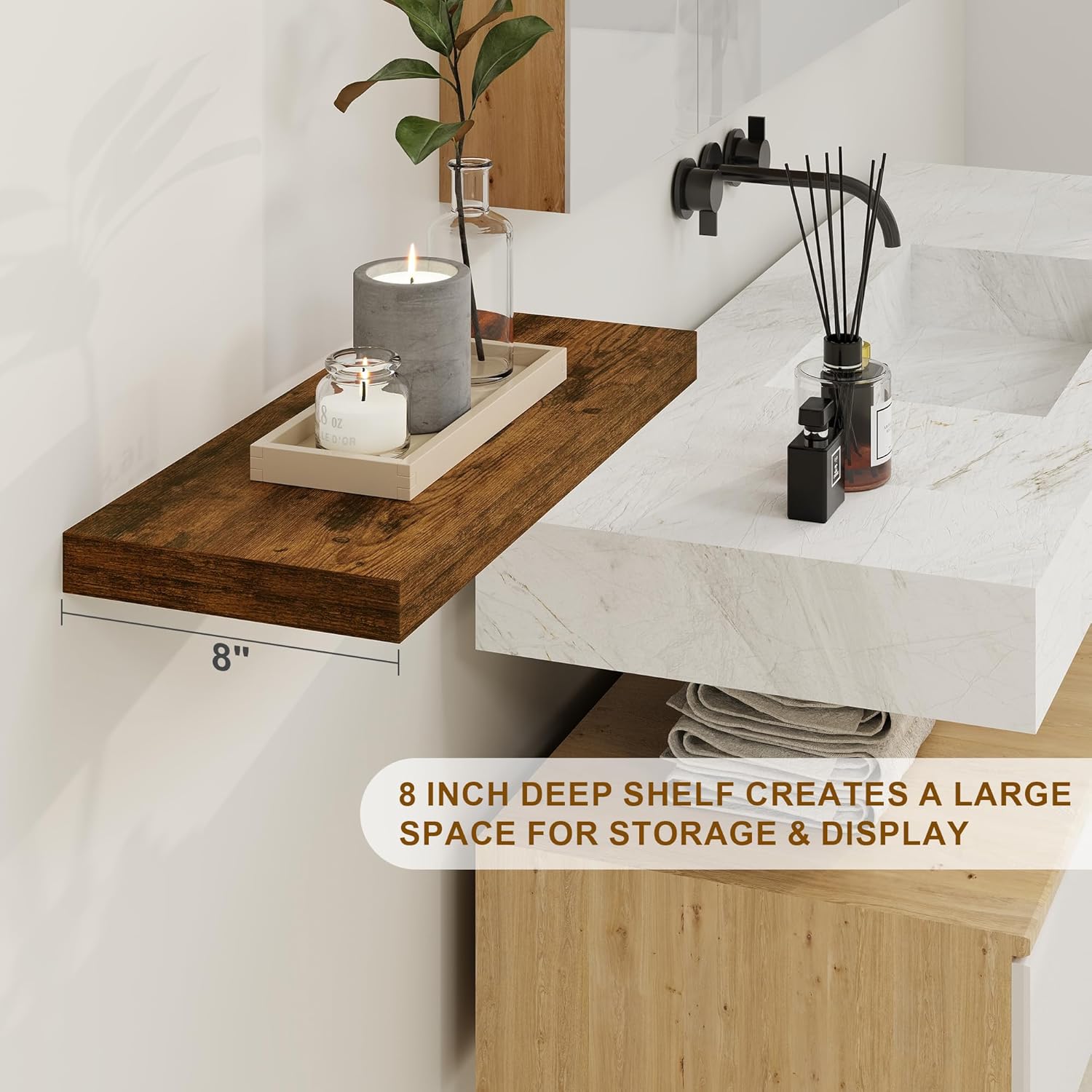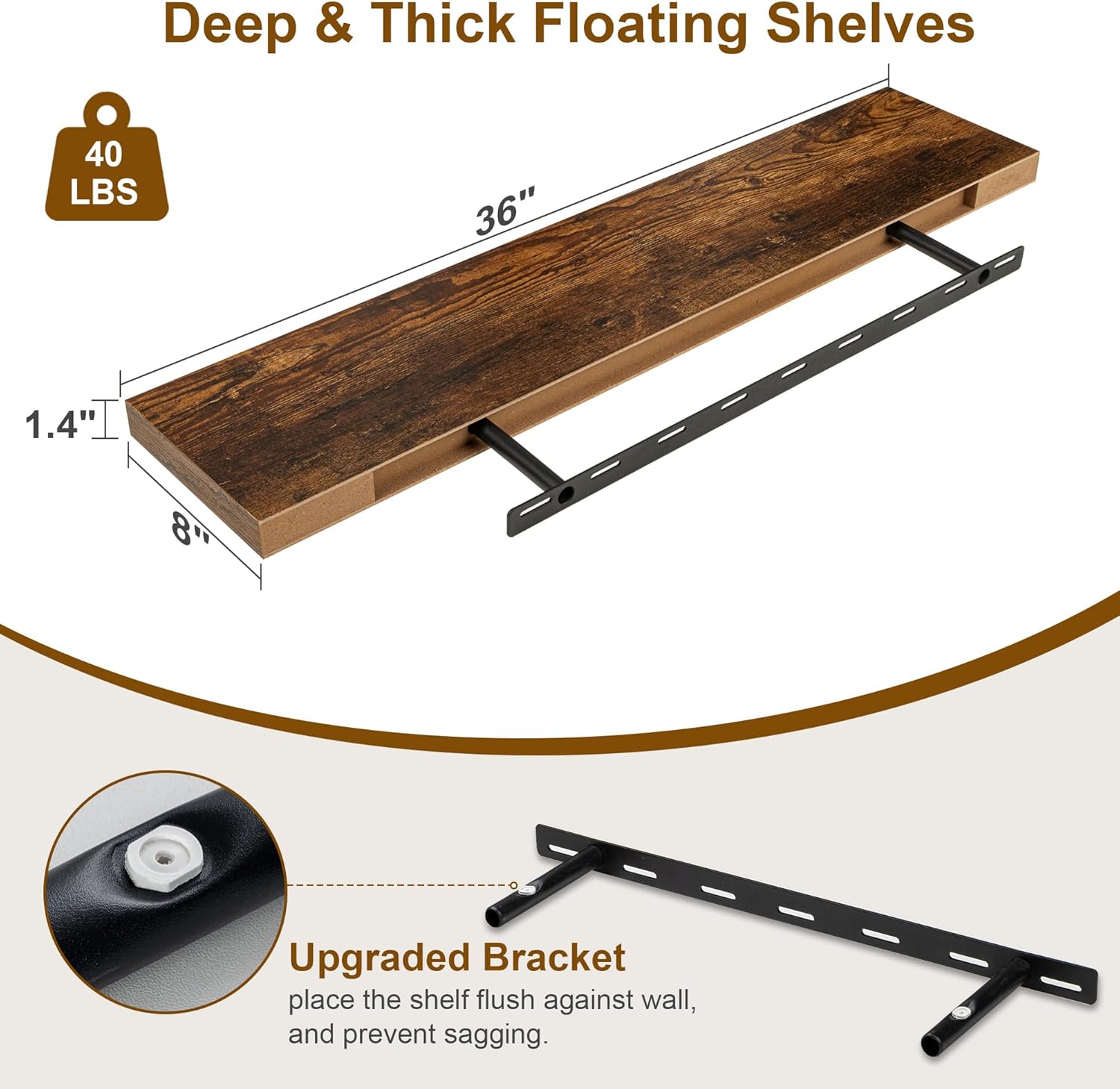 Floating Shelves 36 Inch Long, Deep Floating Shelf for Wall, 36 x 8 Floating Shelves Set of 2, 8 Inch Deep Wall Shelves for Living Room, Kitchen, Bedroom, Large Storage Shelves, Rustic Brown