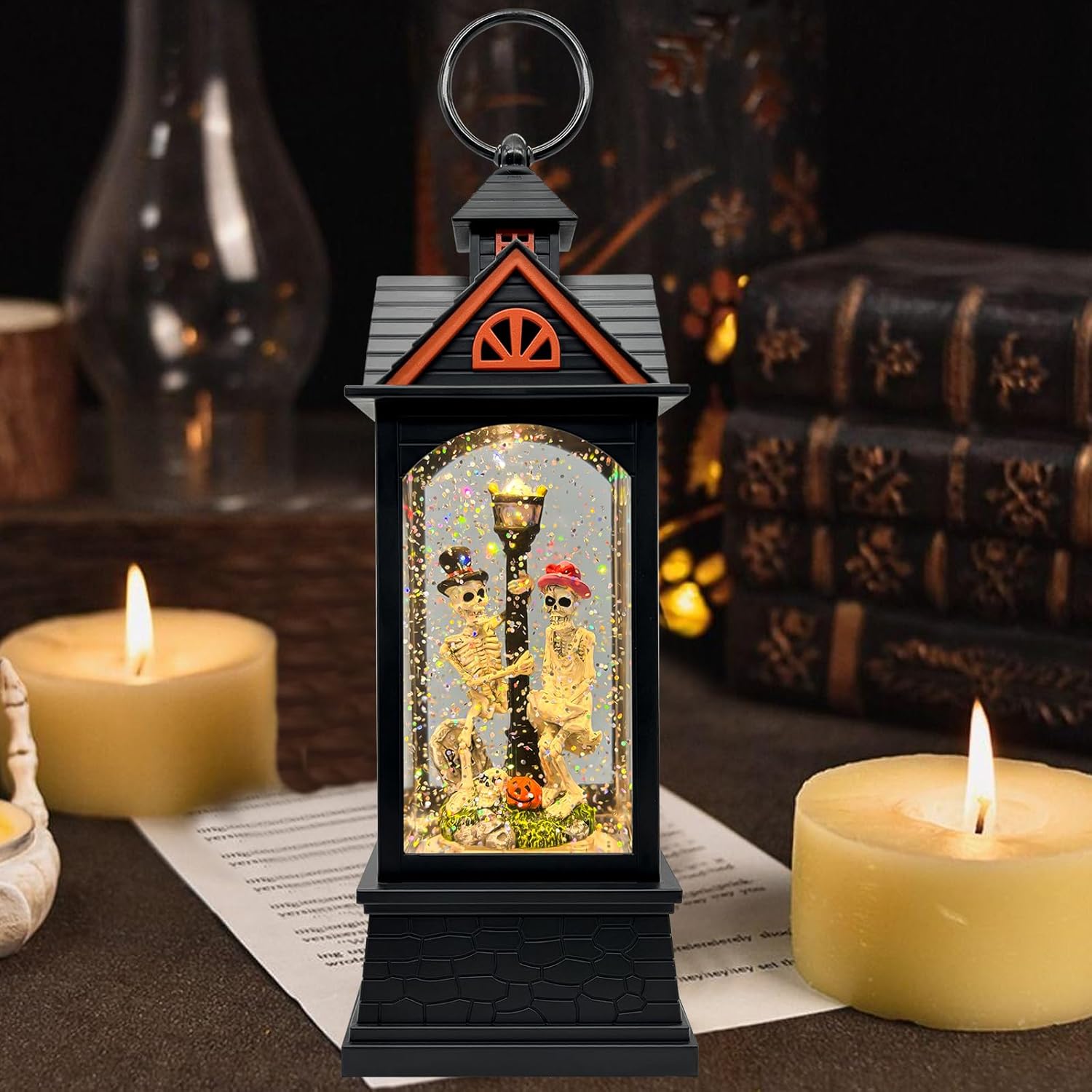 Halloween Snow Globe Lantern with 6 Hour Timer,Halloween Decorations Indoor for Home,Halloween Decor,USB or Battery Powered for Halloween Lanterns,Halloween Skeleton-A