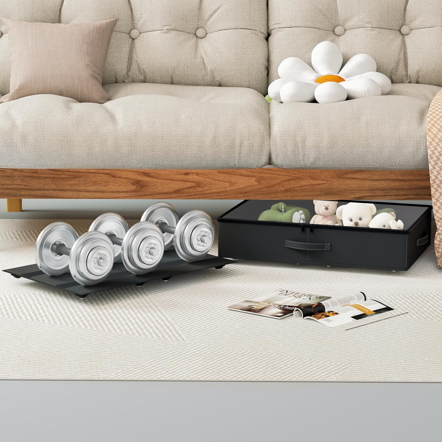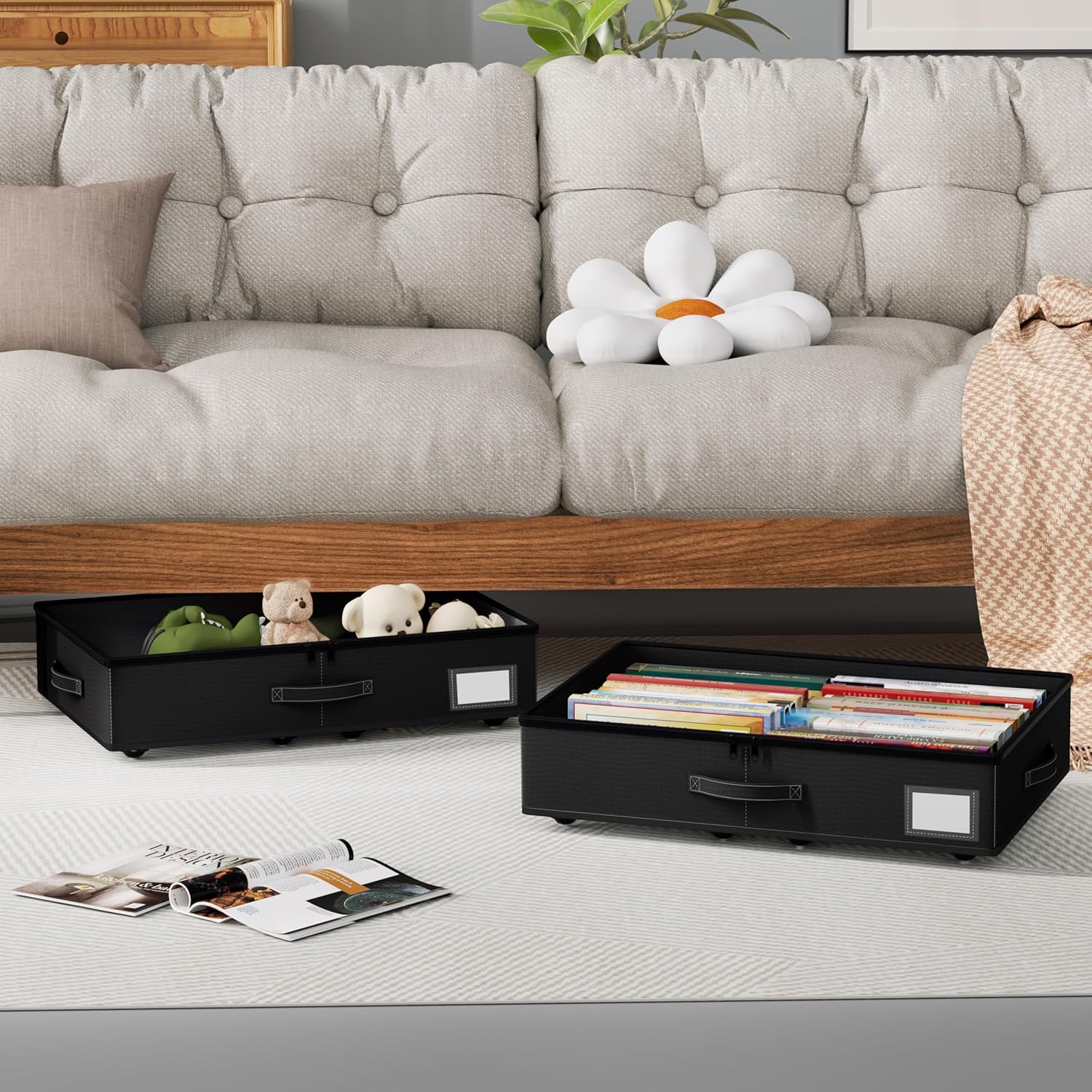 - [Multifunctional Storage Solution]: Our underbed storage box offers versatility for various storage needs. Secured with Velcro, the bottom frame and storage box can be utilized in different places, including closets, cloakrooms, bedrooms, baby rooms, under cribs, and dorms. It's perfect for storing seasonal clothes and everyday items. When not in use, simply fold them up to save space.