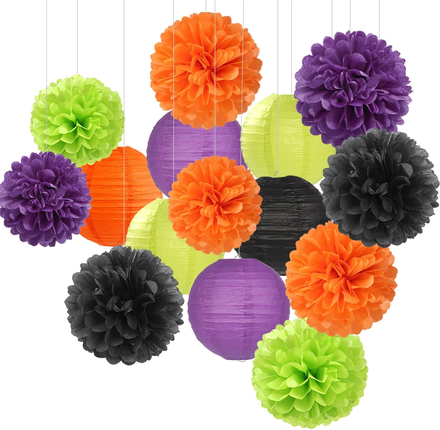 - 【Black Orange Purple Green Party Decorations Kit Includes】The party decorations kits include 9pcs tissue paper flowers: 6pcs 10" and 3pcs 8" in black orange purple green color, 6pcs 8inch paper lanterns.