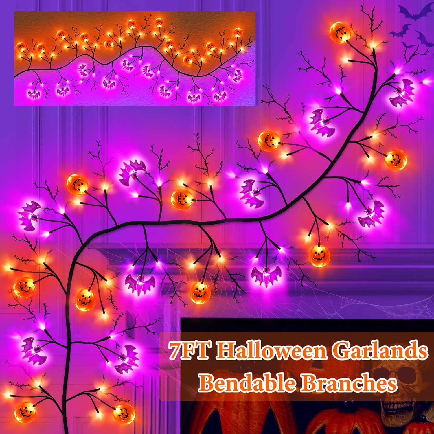 7 Ft 63 LED Halloween Willow Vine Twig Garland with 8 Modes Timer Orange Purple 21 Pumpkin Bats Lights,Halloween Garland with Waterproof Battery Operated for Indoor Wall Fireplace Decorations
