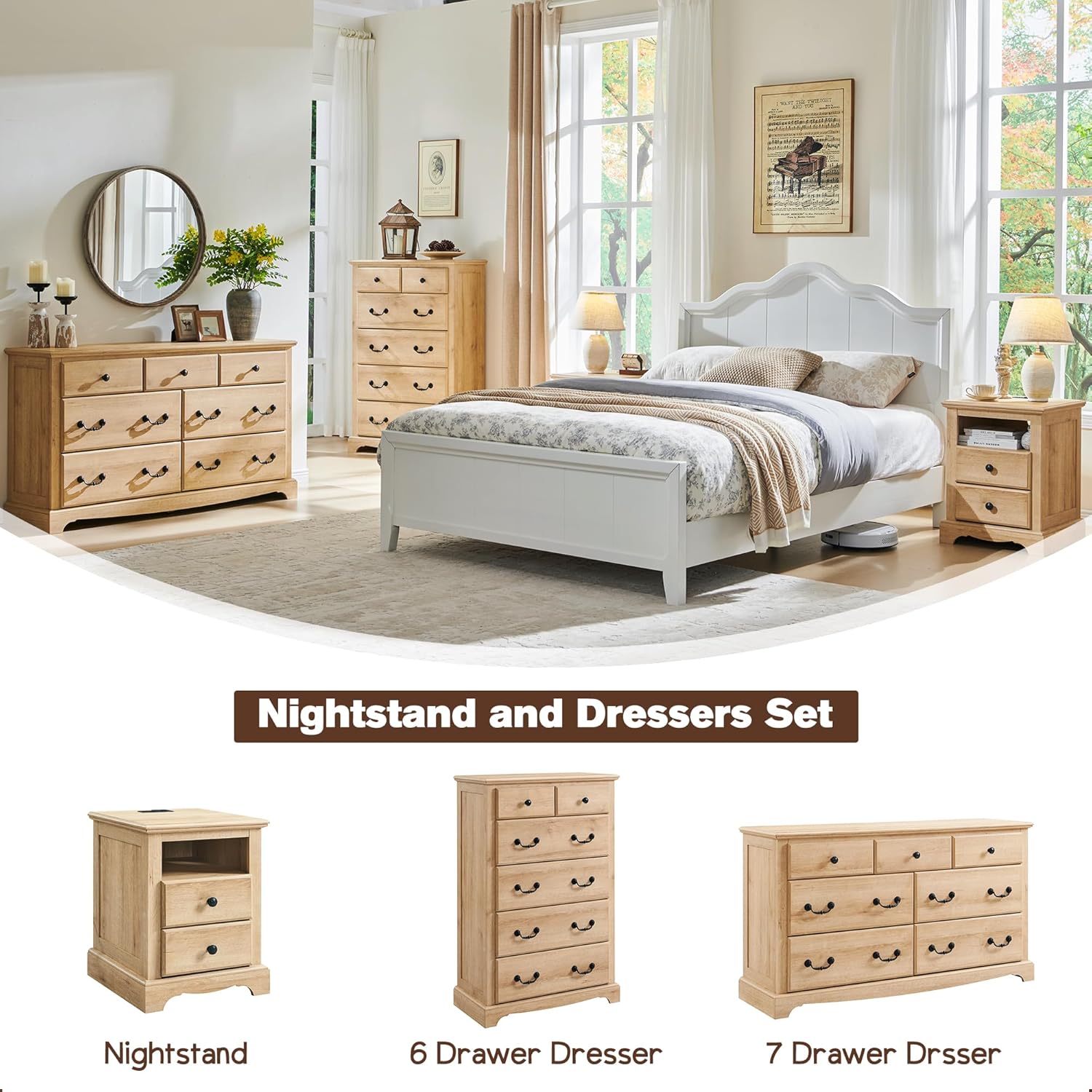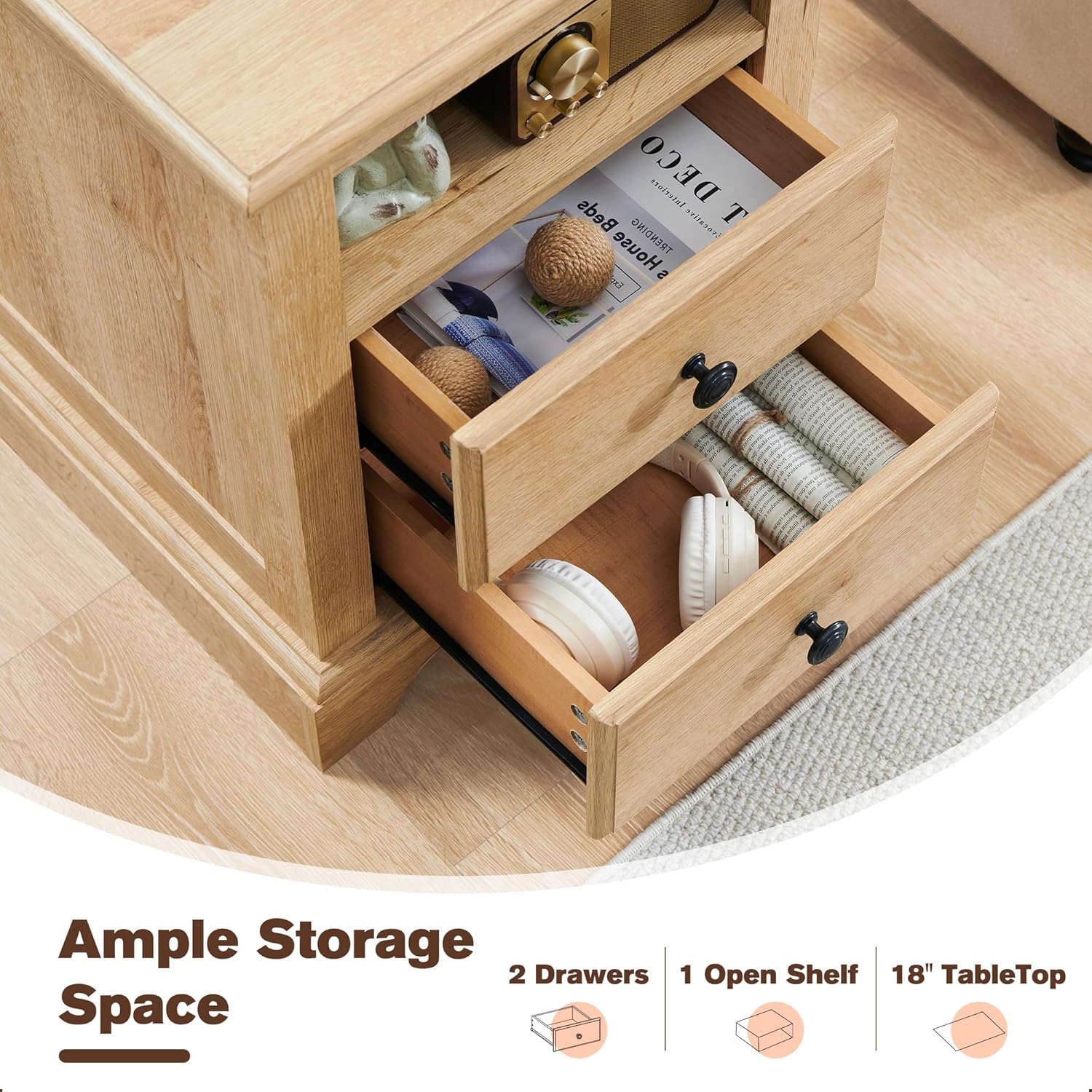 T4TREAM Nightstand with Charging Station, 18 Inch Vintage End Table with 2 Drawers, Wood Rustic Sofa Side Table with Open Storage Shelf for Bedroom, Living Room, Natural Oak