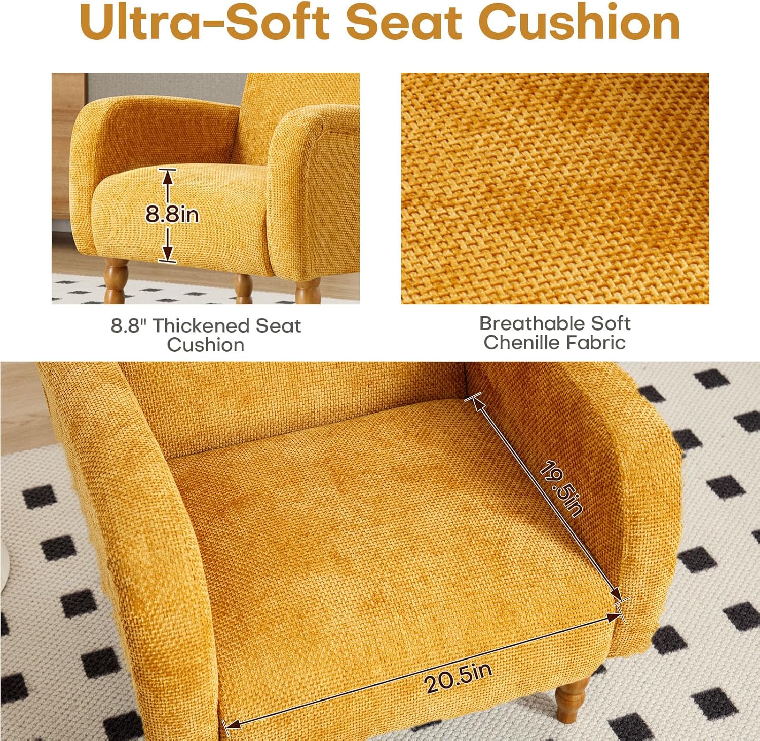 - 【Choose Your Material】These upholstered accent chairs come in two luxurious options: a premium chenille fabric or polyester blend with a knitted jacquard texture. The polyester blend is known for its durability and resistance to wear, ideal for high-traffic areas. The chenille fabric offers a soft, plush feel and elegant appearance, adding sophistication to any room. Both materials provide excellent breathability and comfort, ensuring an exceptional seating experience.