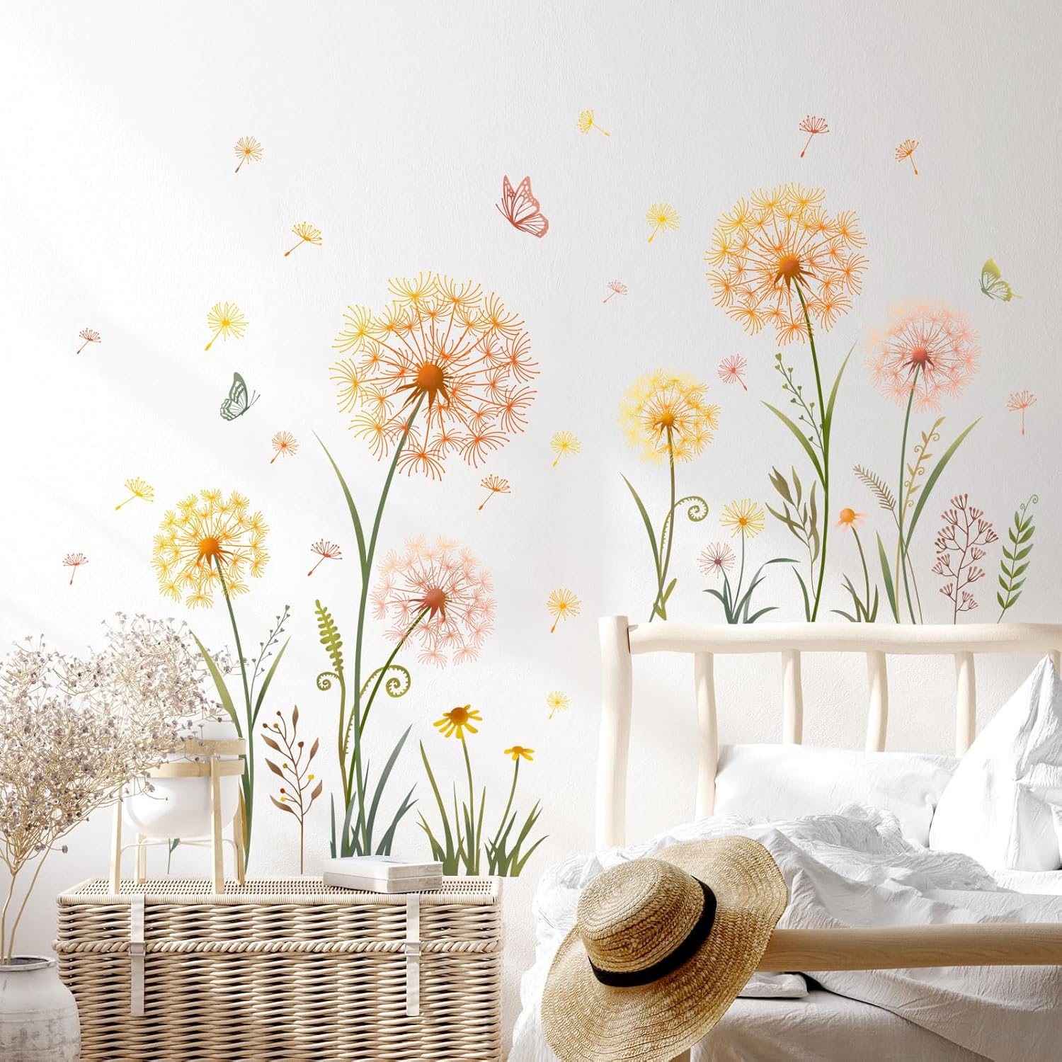 - ăSpecial Designă: Featuring with gold dandelion floral and flying butterflies pattern, this floral wall art decal will give a new look to your space and make your house or office pretty and fashionable. Add a decorative element without blocking the view.