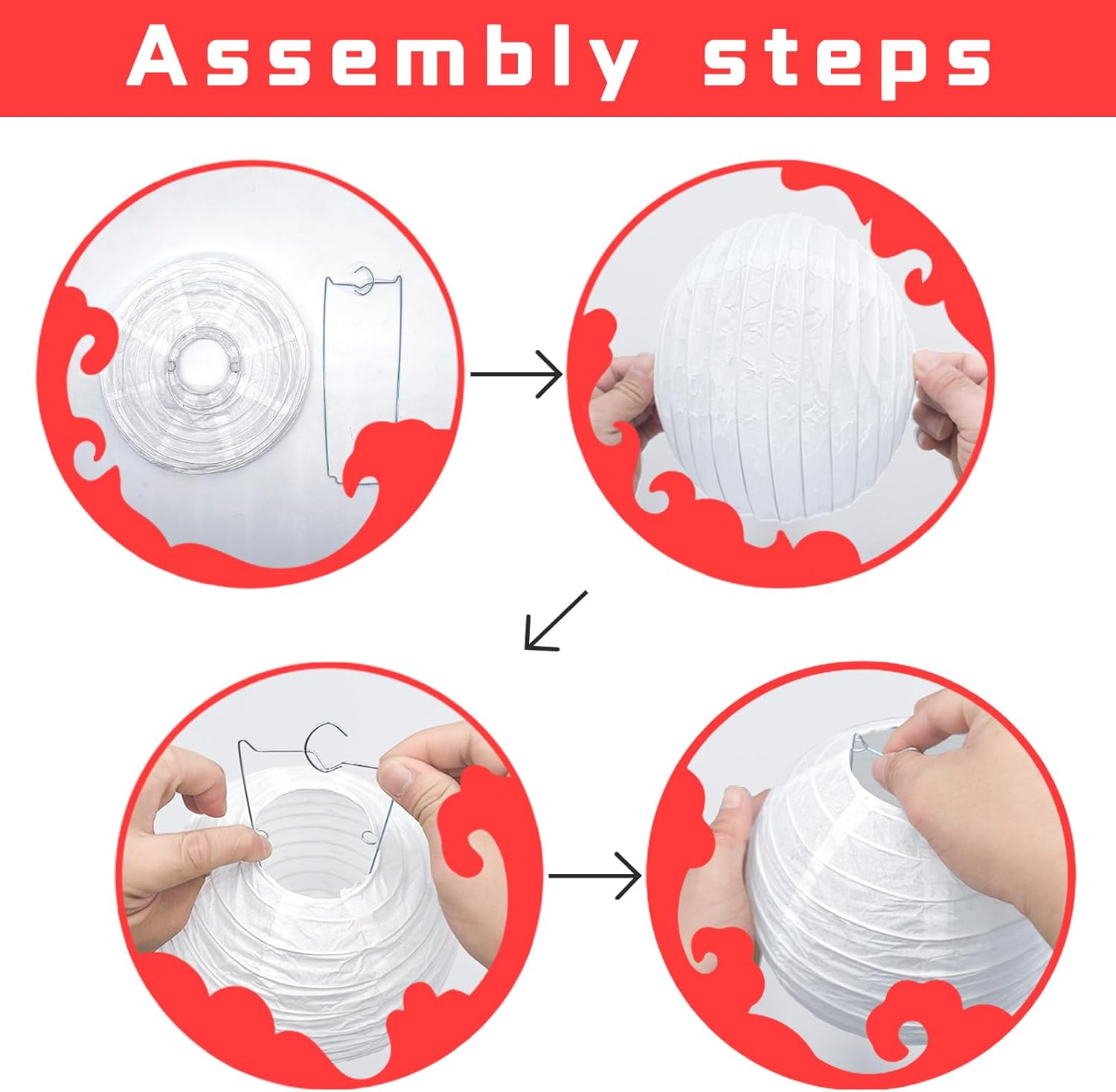 - 【Easy to assemble】: Our lanterns are easy to unfold, assemble and hang up, and they can be folded flat for storage. All you need to do is to pull the two ends gently to open the lantern and insert the metal frame (included in the pack) into the lantern to keep its shape.