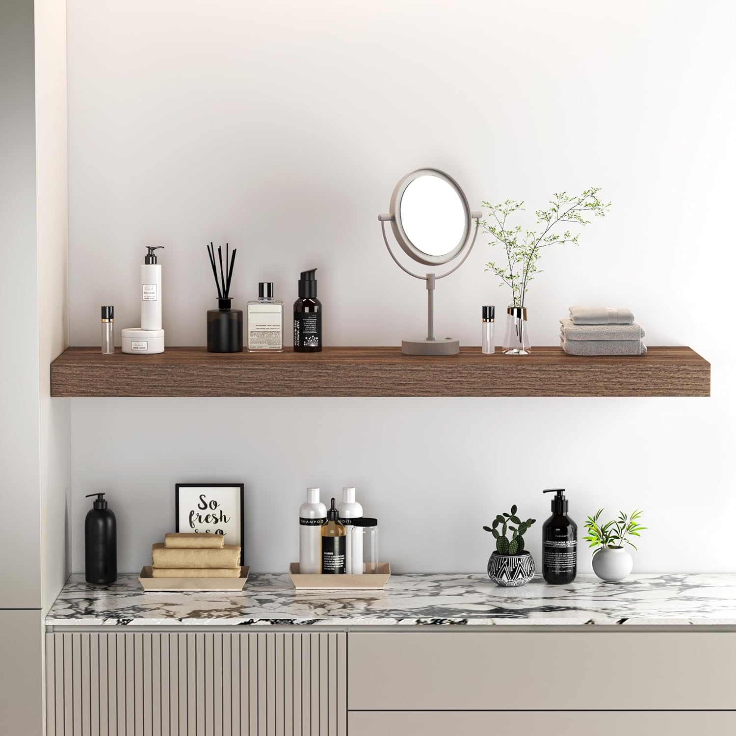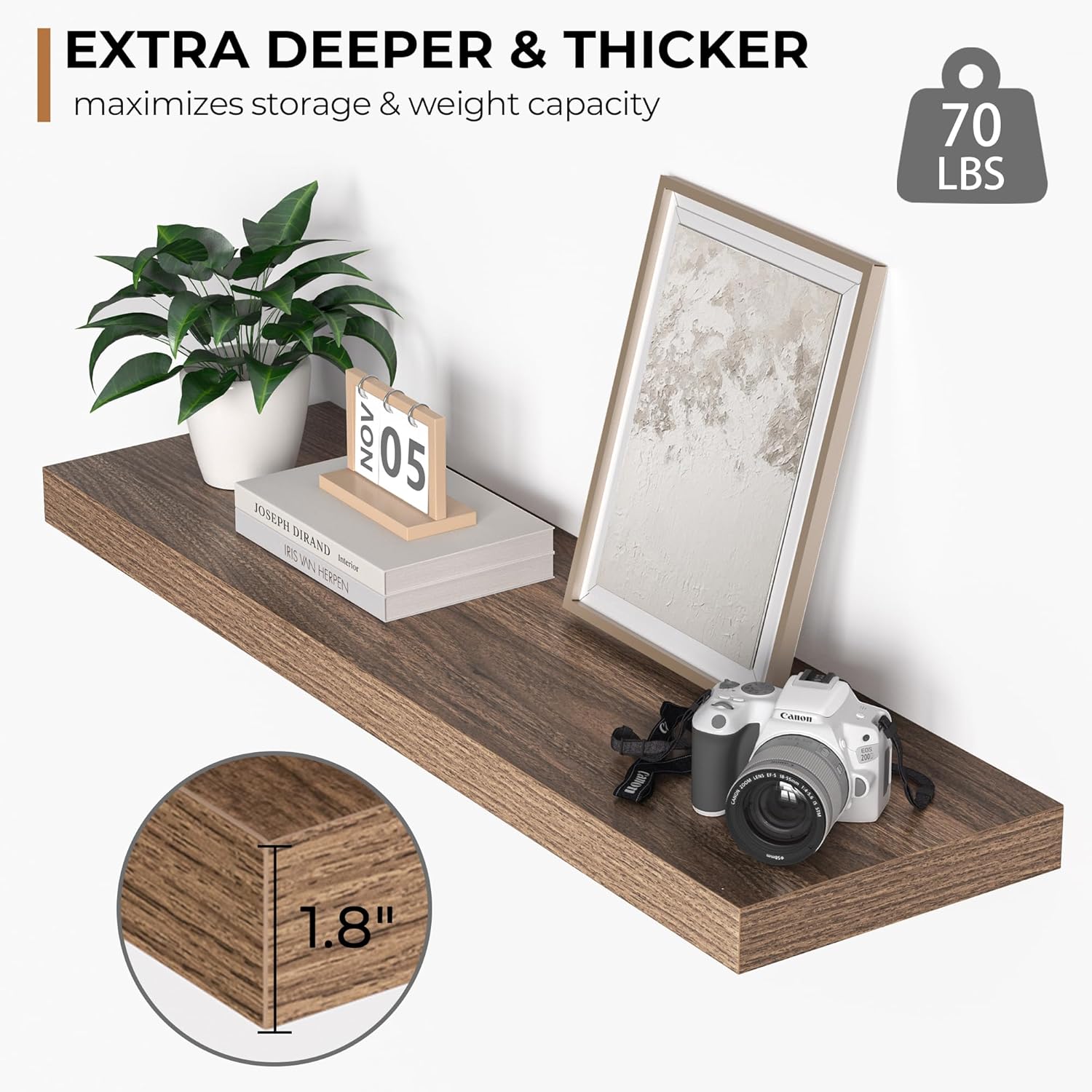 - Extra Deeper & Thicker - This wall shelf measures 36"W x 10.23"D x 1.8"H. Extra deeper and thicker design in order to bring maximizes storage space and weight capacity, even hold up to 70 lb. This floating shelf taking up zero square feet, reduces clutter and highlights dƩcor in compact spaces.