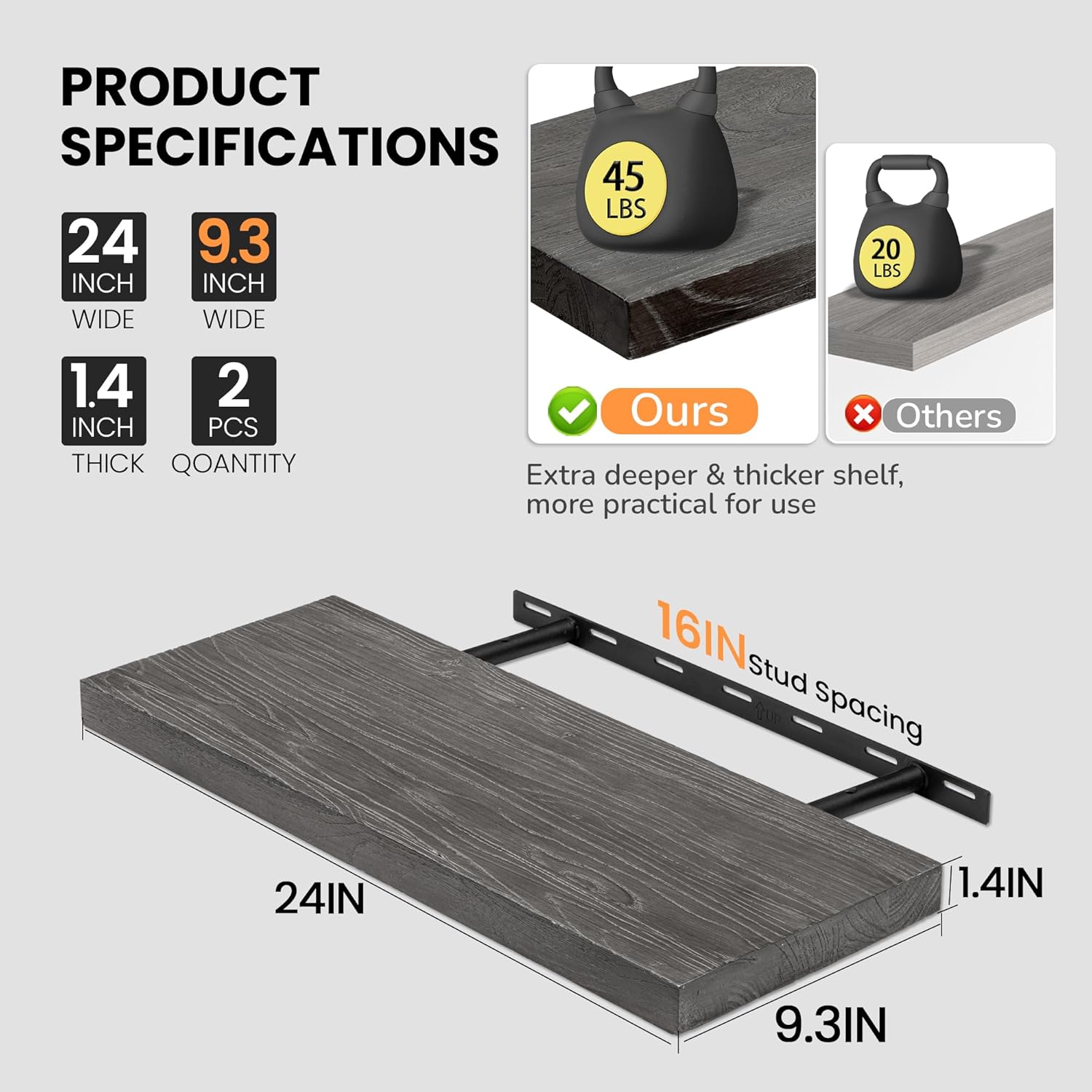 Fun Memories Floating Shelves for Wall, 24"x9.3" Rustic Solid Elm Wood Shelves, Heavy-Duty Wall Mounted Shelves with Invisible Brackets, Set of 2 for Living Room, Bedroom, Kitchen, Natural Finish
