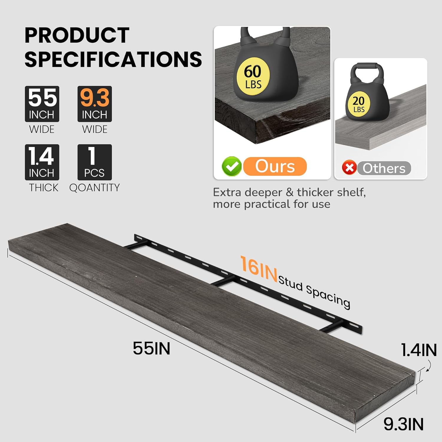 Fun Memories Floating Shelves for Wall, 55"x9.3" Rustic Solid Elm Wood Shelves, Heavy-Duty Wall Mounted Shelves with Invisible Brackets, Set of 2 for Living Room, Bedroom, Kitchen, Grey Finish