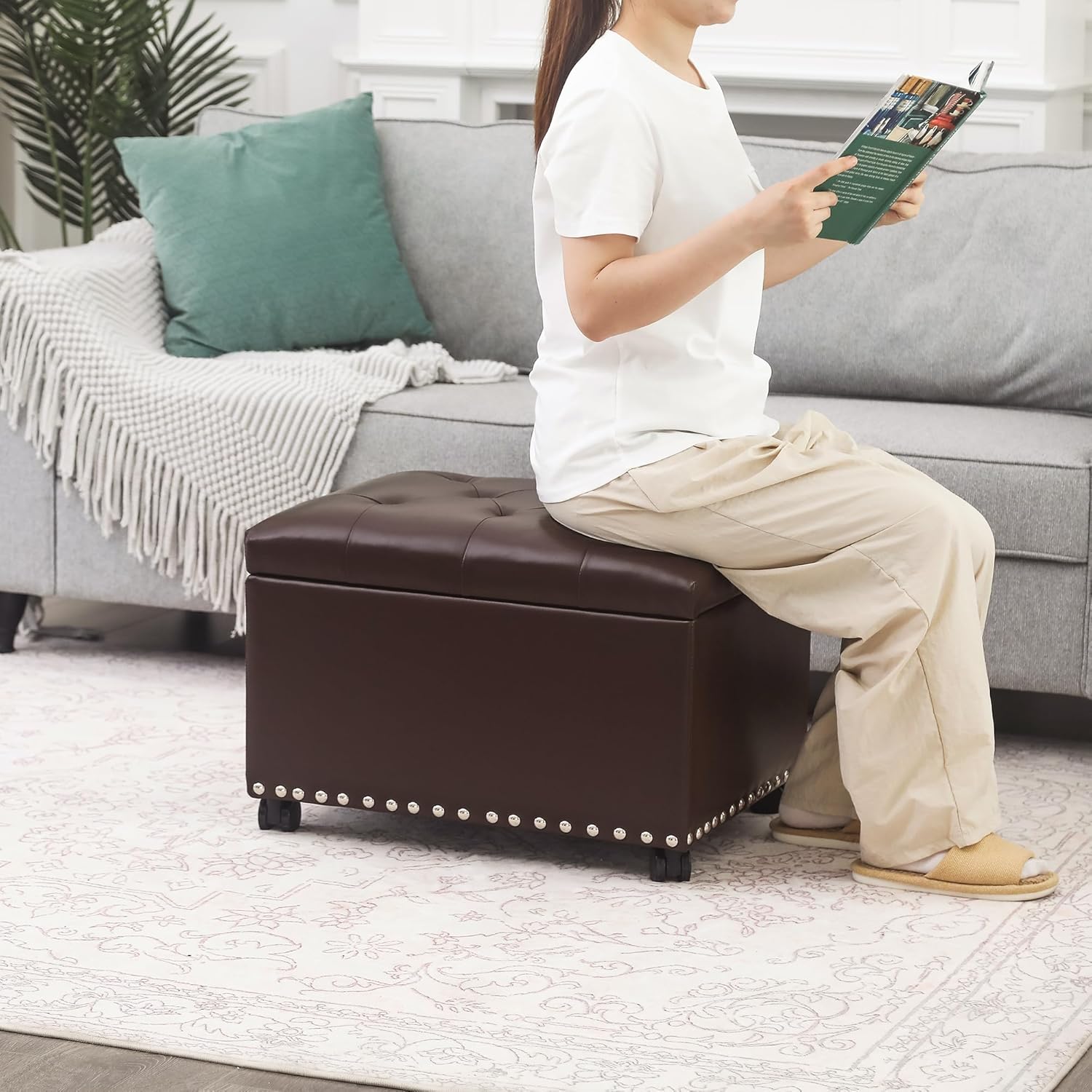 Joveco Leather Storage Ottoman with 360° Wheels 24" Rolling Foot Rest Bench Rectangle Ottomans Stool for Living Room Bedroom (Brown, Wheels)