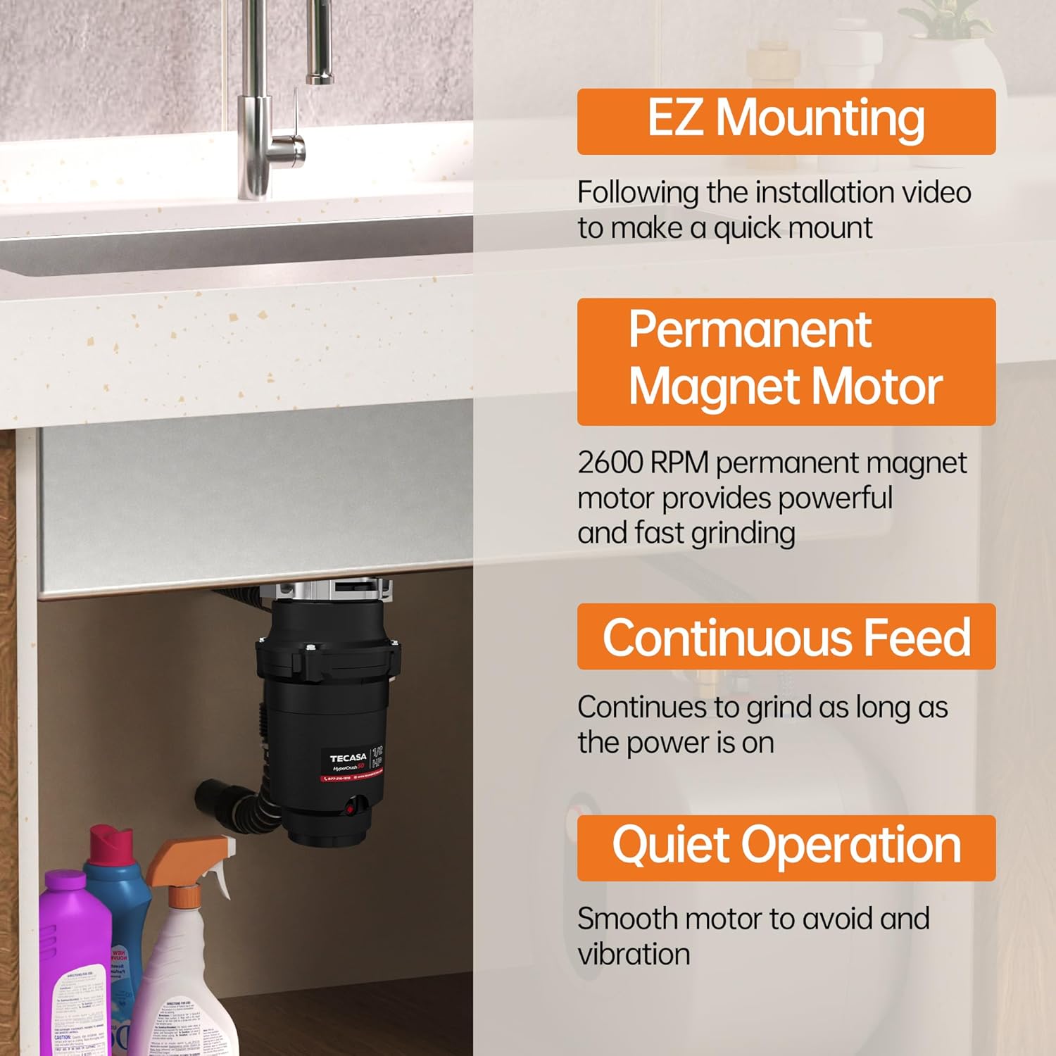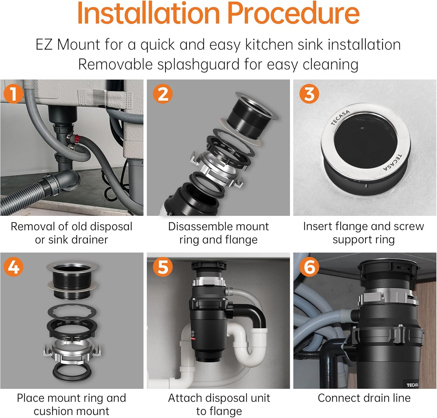 • SIMPLE INSTALLATION: The sink disposal features a compact size and mount design that fits most existing EZ mounting assemblies, making it easy and fast to install or replace. It's compatible with other popular brands.TECASA garbage disposal is suitable for most home kitchens for standard 3-1/2 inch sink opening hole. A pre-installed 39" power cord for electricity connection.