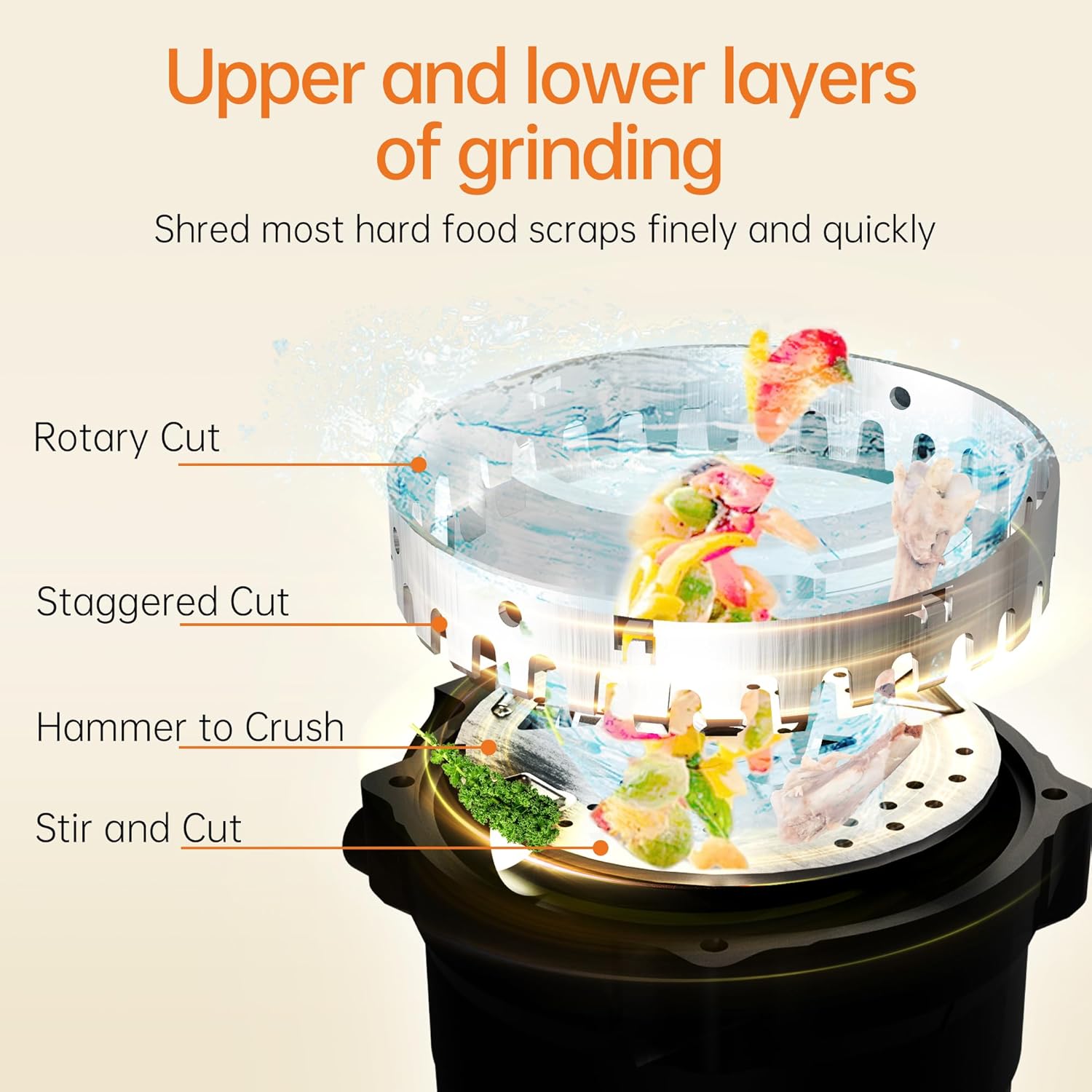 • FINER GRIND: The 1/2 HP garbage disposal features a 2-stage grinding system designed for efficient and multi-dimension grinding. With a 2600 RPM DC motor and high-quality, durable stainless steel grinding components, it can effectively turn pericarp and scraps into particles after 2 stages of grinding. You can see there are no large debris left in the grinding chamber. You don't have to worry about clogged drains!