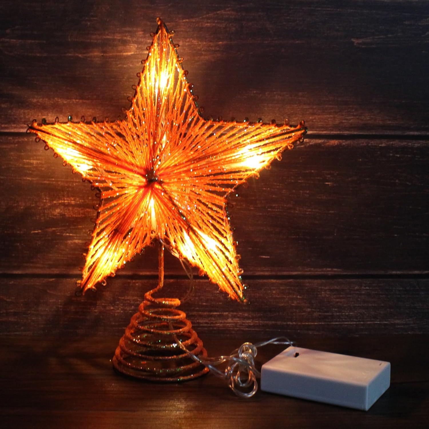 CVHOMEDECO. Orange Glittered 3D Tree Top Star with Warm White LED Lights and Timer for Christmas Tree Topper Decoration and Holiday Seasonal Décor, 8 x 10 Inch