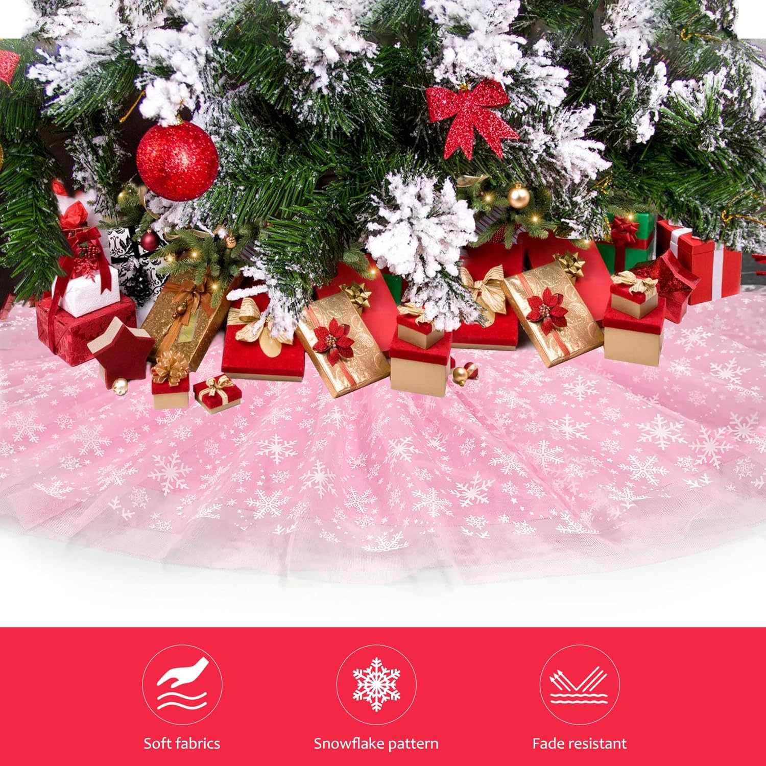 Christmas Wedding Tree Skirt, 4 Layer 45 in Snowflake Tulle Tree Decoration for Party Indoor, Fluffy Tree Cover Mat Ornament for Holiday, Pink
