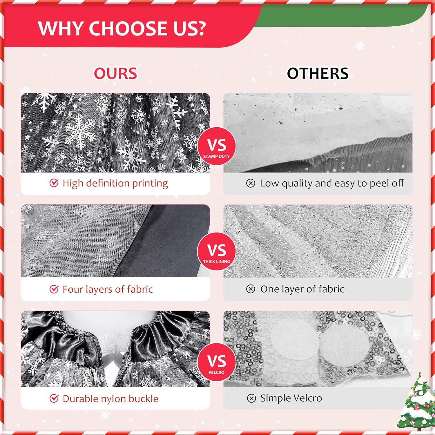 - Premium Material:This Xmas tree skirt is made of high quality material with 4 layers;1 layer of snowflake patterned tulle,2 layers of sheer tulle, and a layer of polyester fabric;fluffy material will make Christmas tree transform into a lovely princess