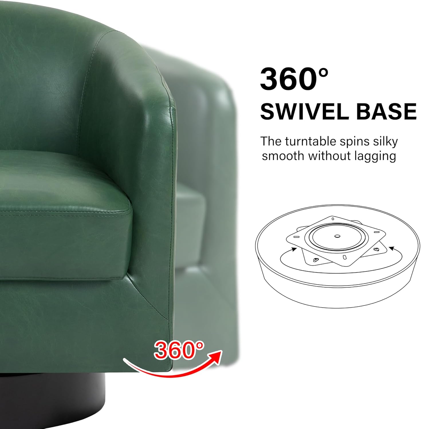 Swivel Barrel Accent Chair, Modern Round Faux Leather Arm Chair for Living Room, Bedroom, Comfy Club Reading Chairs for Adults(Faux Leather, Green, Set of 1)