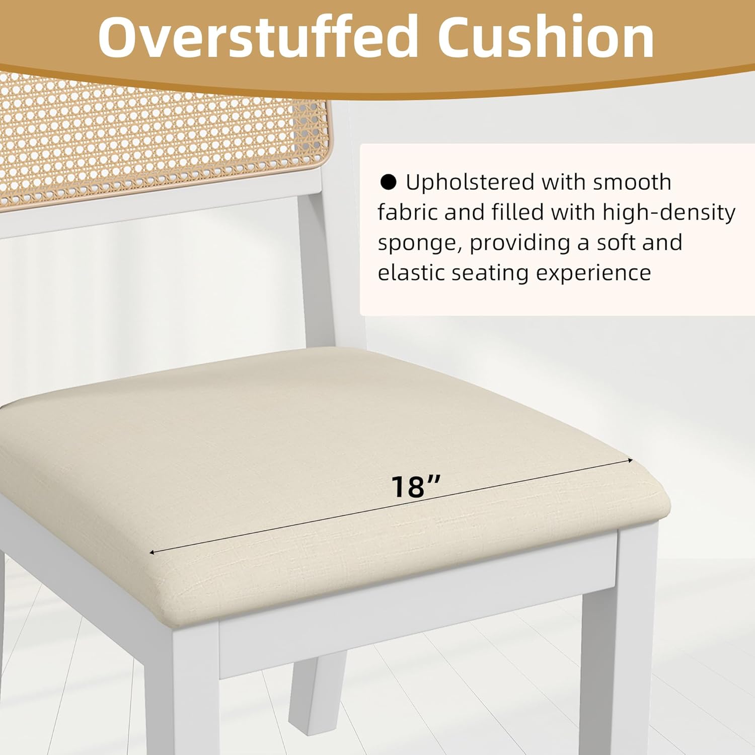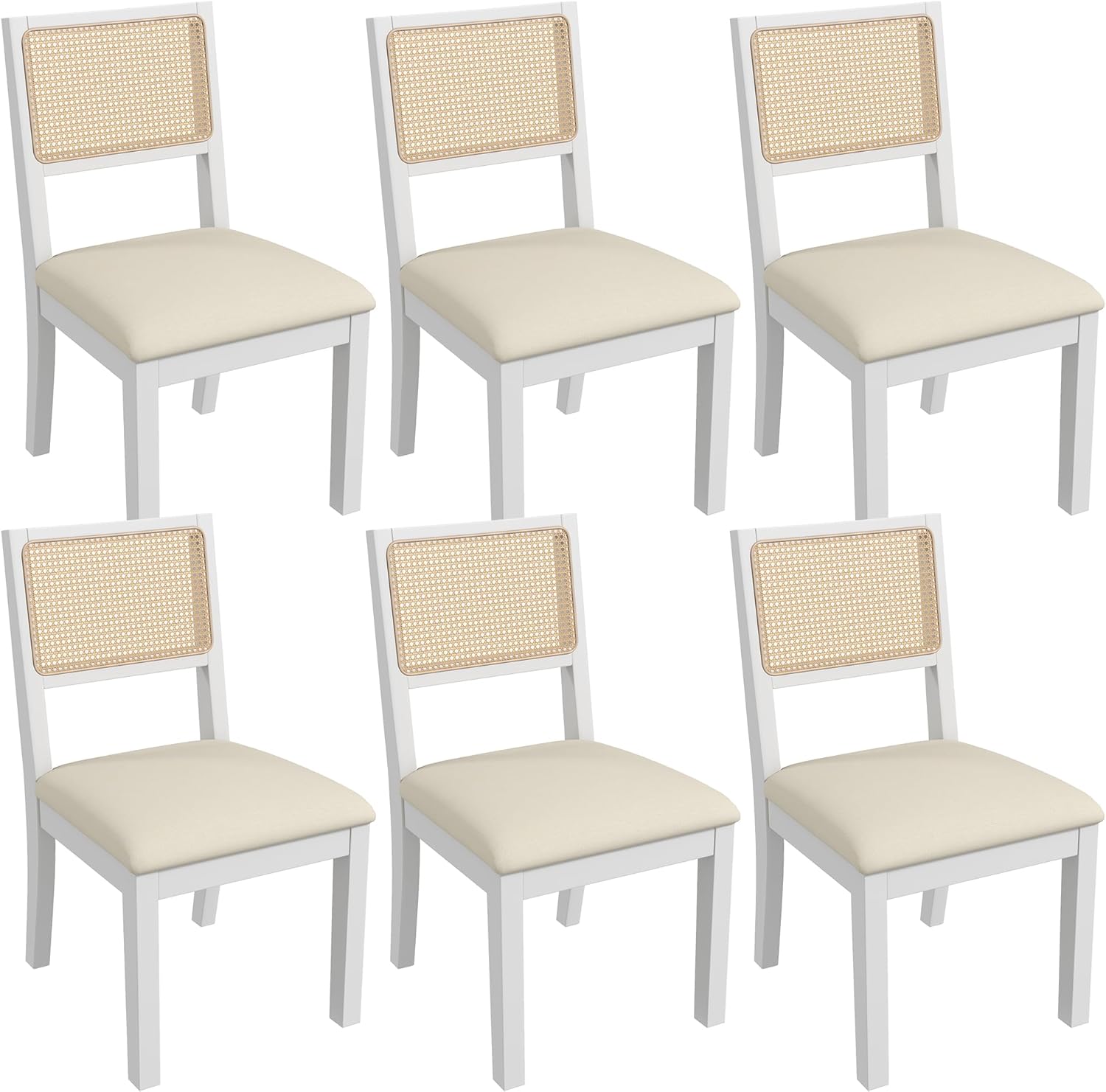 Westice Rattan Dining Chairs Set of 6, Farmhouse Natural Dining Room Chairs with Upholstered Cushion, Wood Armless Chairs for Kitchen/Restaurant, White