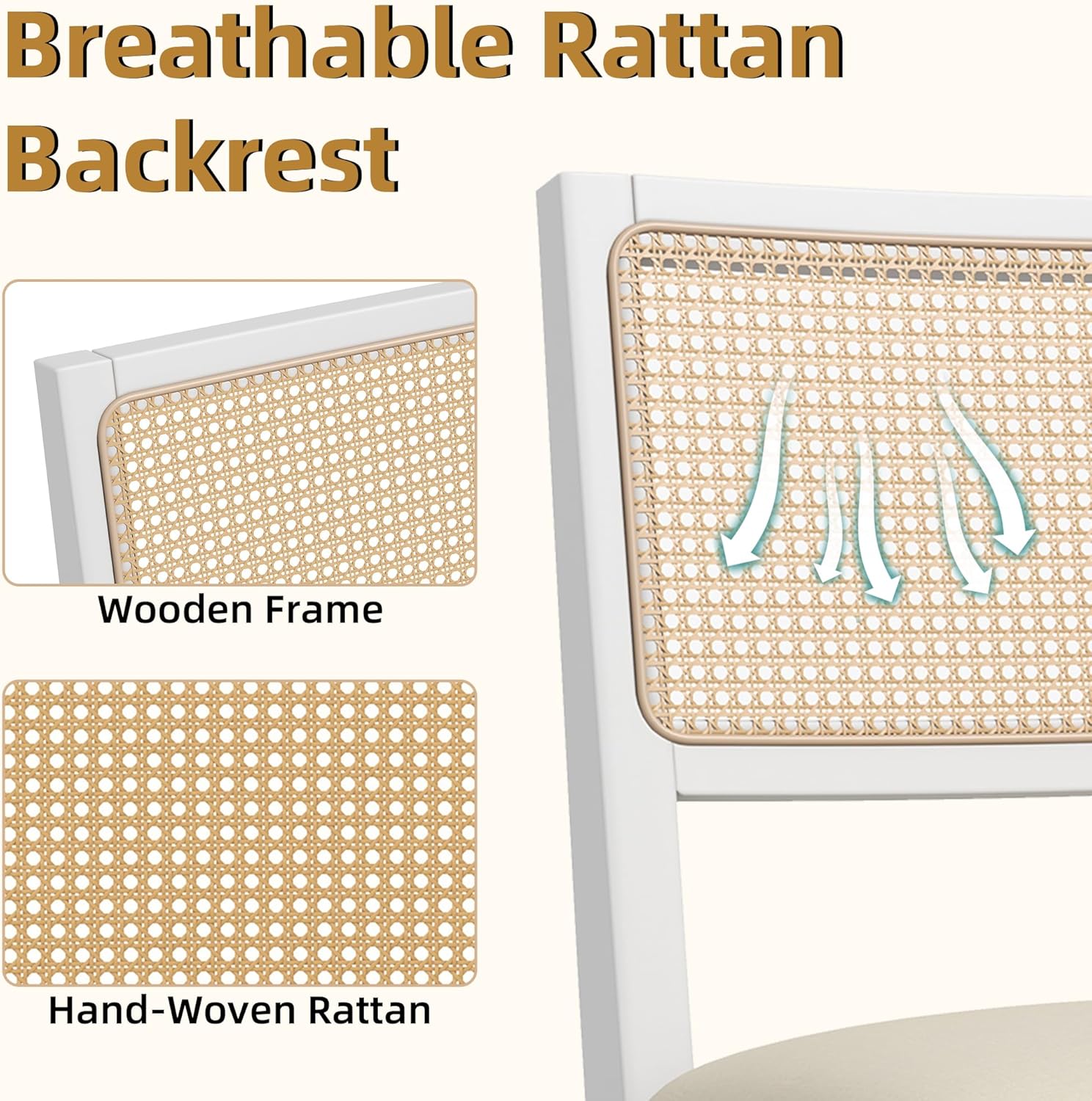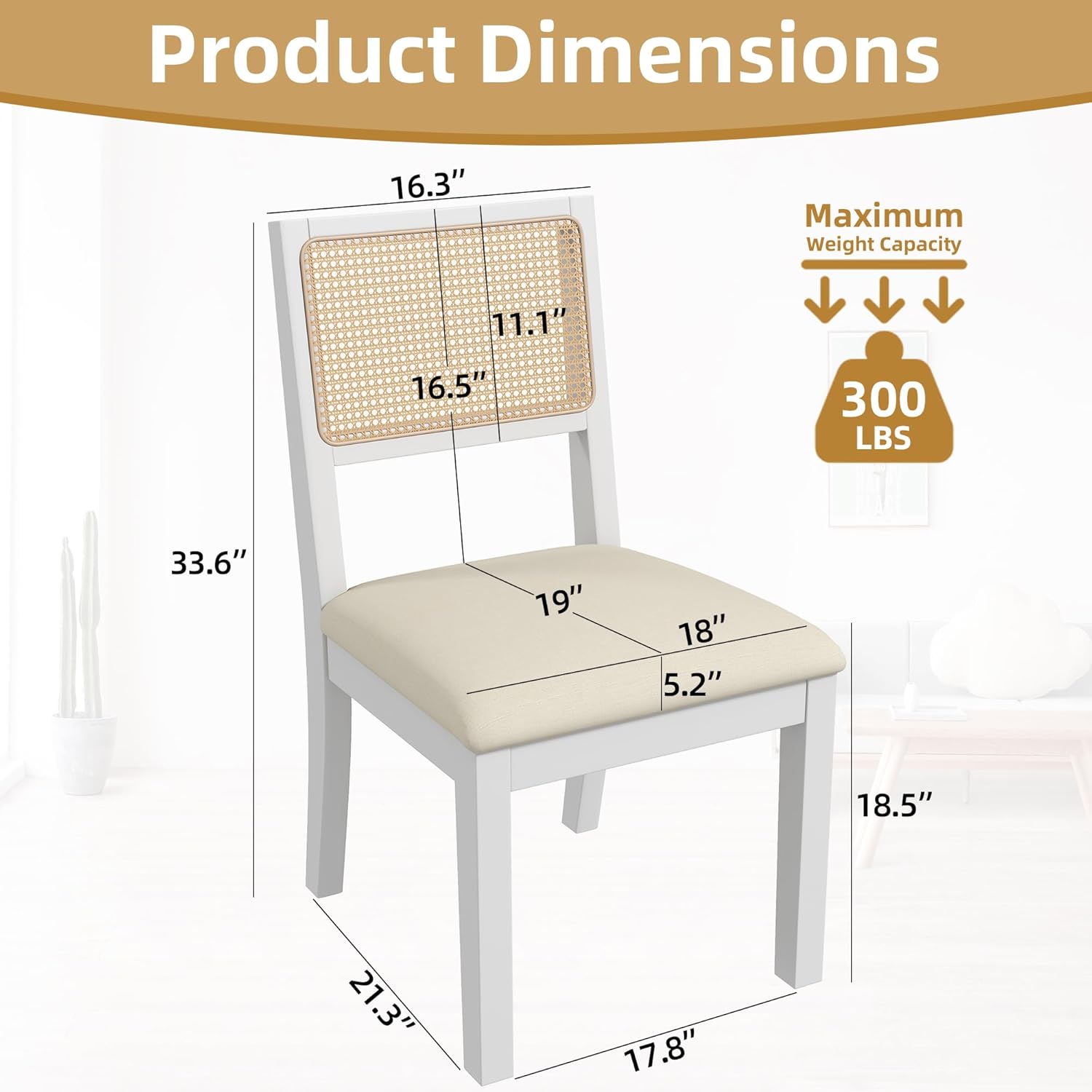 Westice Rattan Dining Chairs Set of 2, Farmhouse Natural Dining Room Chairs with Upholstered Cushion, Wood Armless Chairs for Kitchen/Restaurant, White