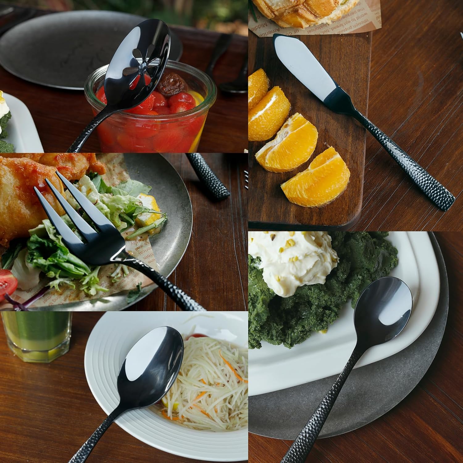 Silverware 45-Piece Black Hammered Flatware Set with Serving Utensils Stainless Steel Thick Handle Mirror Polished Cutlery Set for Wedding Hotel Restaurant, Service for 8