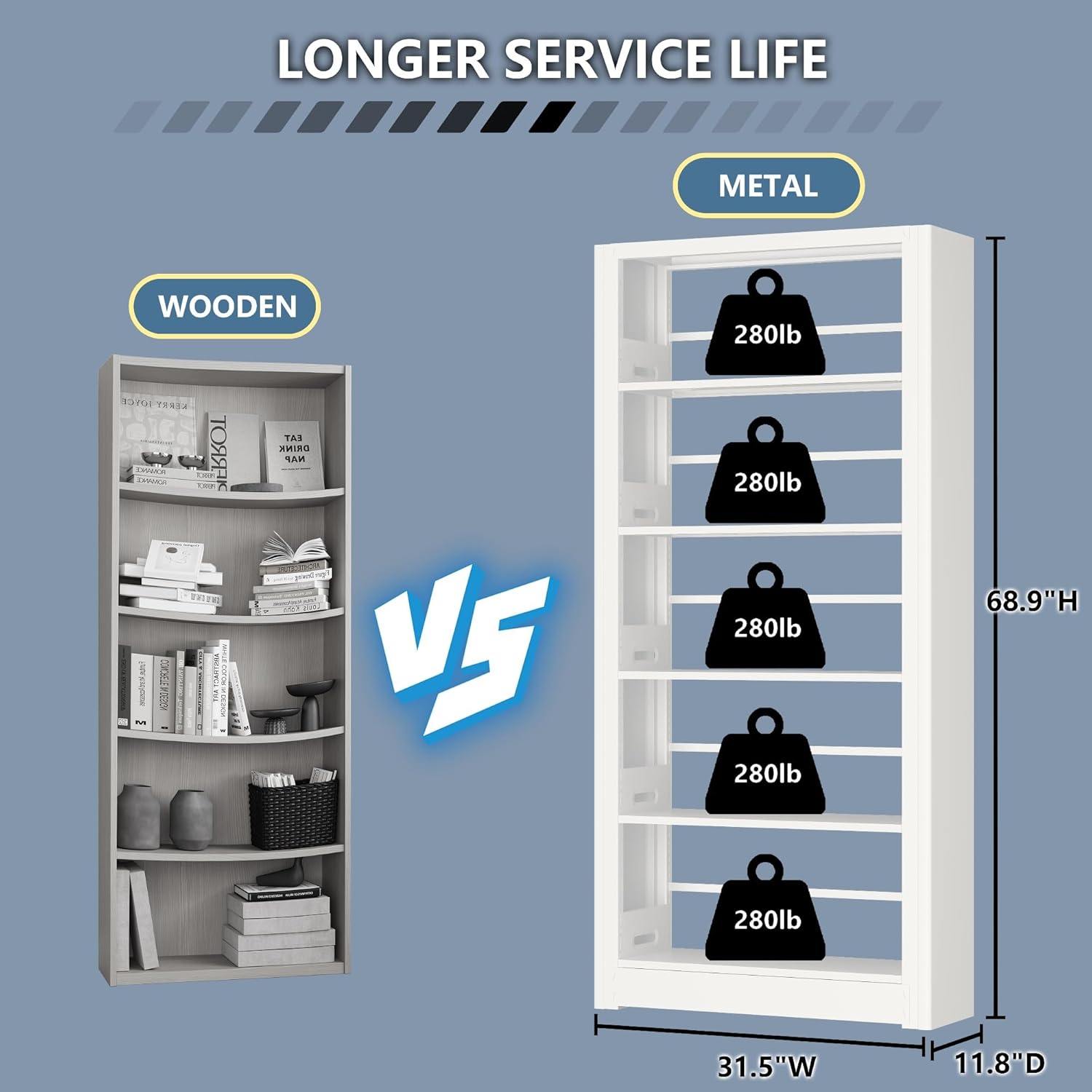 - 【Metal Bookshelves and Bookcases】Metal Bookshelf is more modern than wooden cabinets, easier to install, greater load-bearing capacity, and free from formaldehyde and odors. Shelves for living room. 5-tier large bookshelves with adjustable shelf, single layer can holds 280 pounds. Heavy duty bookshelf adopts thickened columns, ensure load-bearing capacity while keep stability. Deep shelf bookcase is rustproof and easy to clean. Bookshelf with modular expansion capability can placed more heavy books.