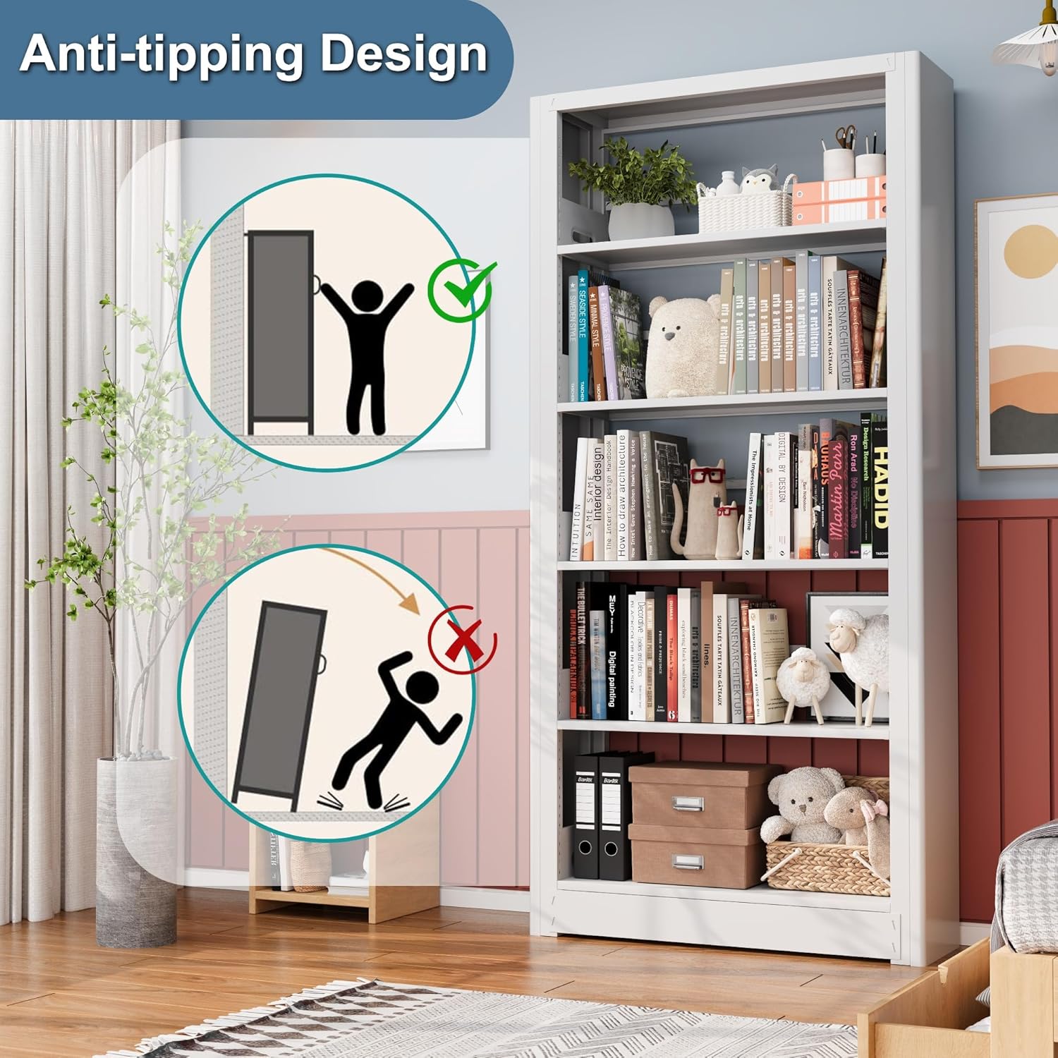 - 【Safety Design】The high shelves are designed with rounded corners on both sides and anti-tipping design on the back to reduce bumping, safer for home use. The surface of the white bookshelf is made of high quality powder coating process, very easy to clean, no formaldehyde, no odor, suitable for use as home,office and school shelves.