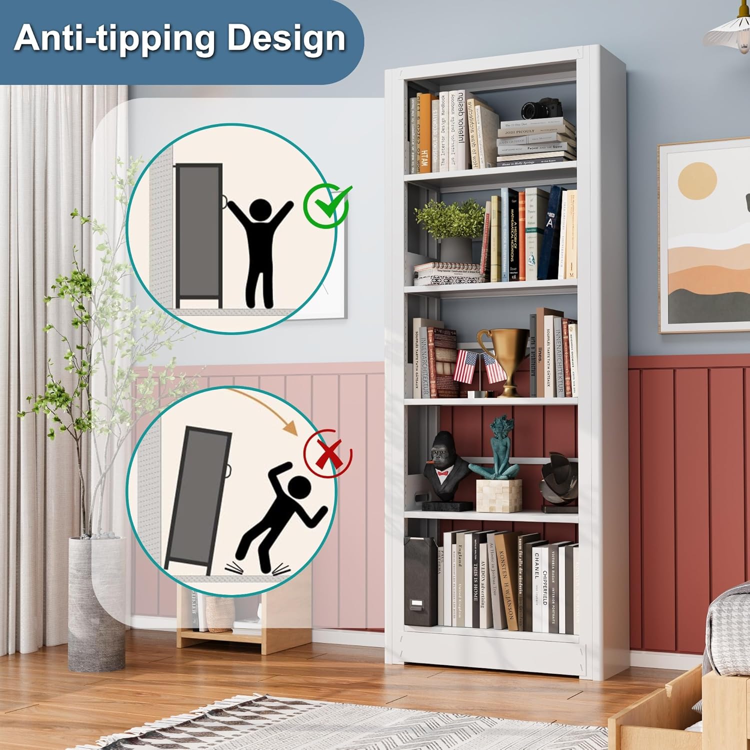 - 【Adjustable Bookshelf】Open shelves bookcase has 5 tiers, you can adjust the height at will according to your needs. Adjustable shelves can place heavy books, photo albums, store toys, make your room more neat and organized. Meanwhile, the metal bookshelf has adjustable stopper to protect your items from falling. If the 5-Tier shelves cannot meet the storage needs,you can also purchase additional layer board accessories.