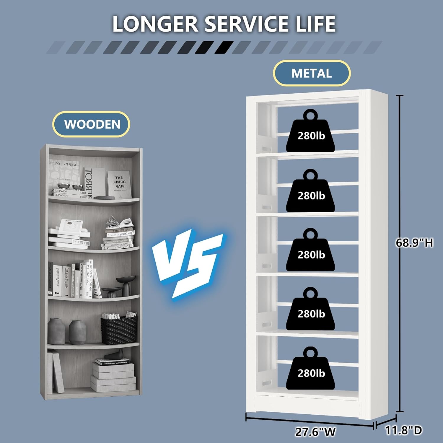 - ăAdequate Display SpaceăHeavy-Duty bookshelves measure 69"H*27.5"W*11.8"D. Wide bookcase are taller and deeper than other bookshelves, able to organize more items. Large Industrial book cases shelves organizer can be used as display shelf, standing shelf, storage shelf, office shelf, garage shelf, and can be placed in living room, garage, study, and office.
